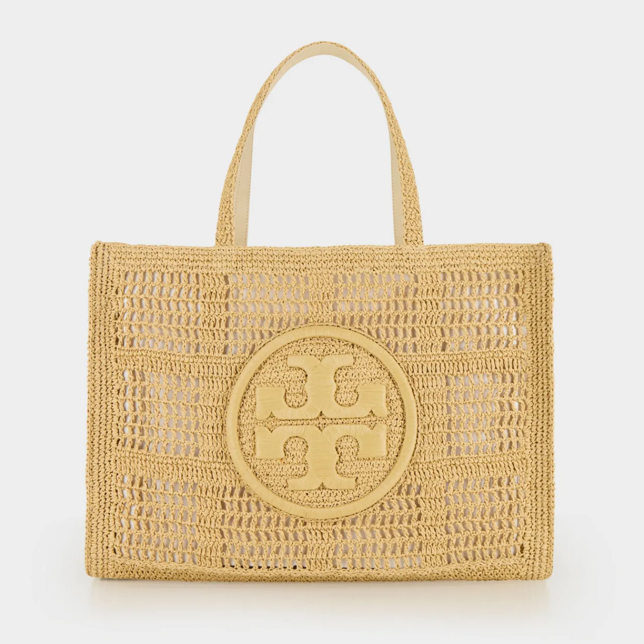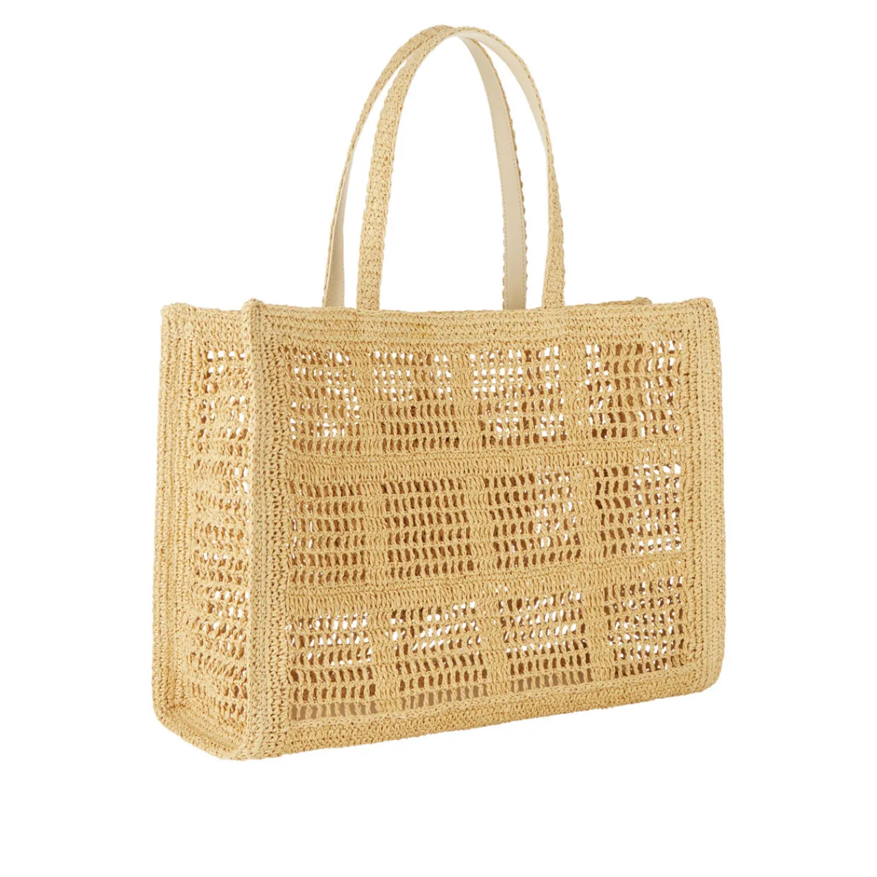 - Unlined, open top, openwork crochet construction, double handles