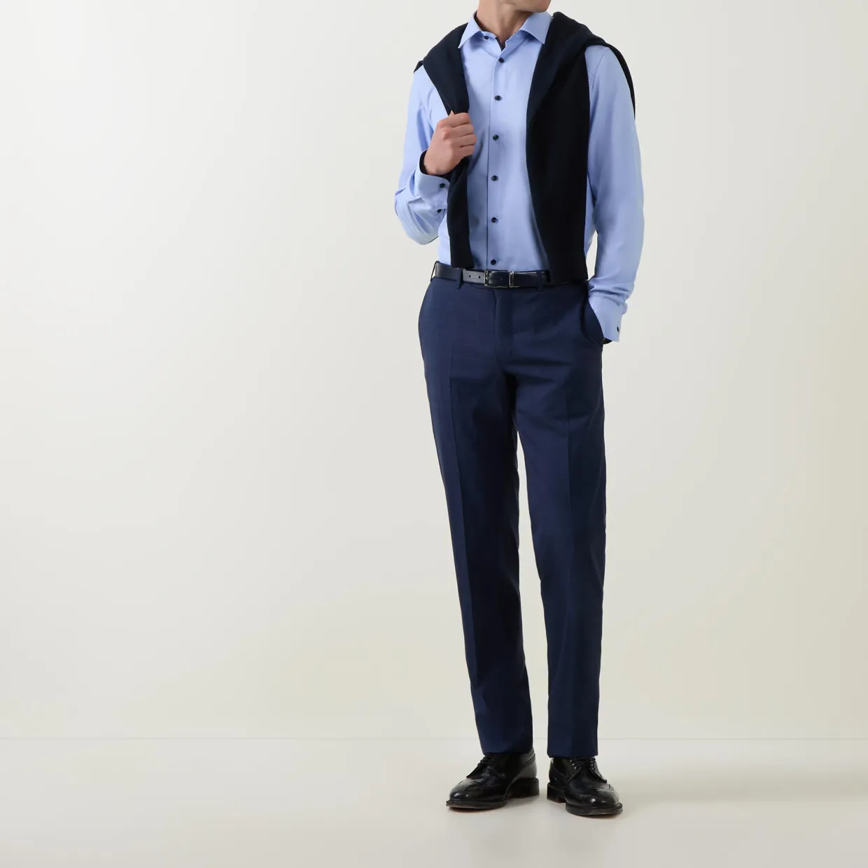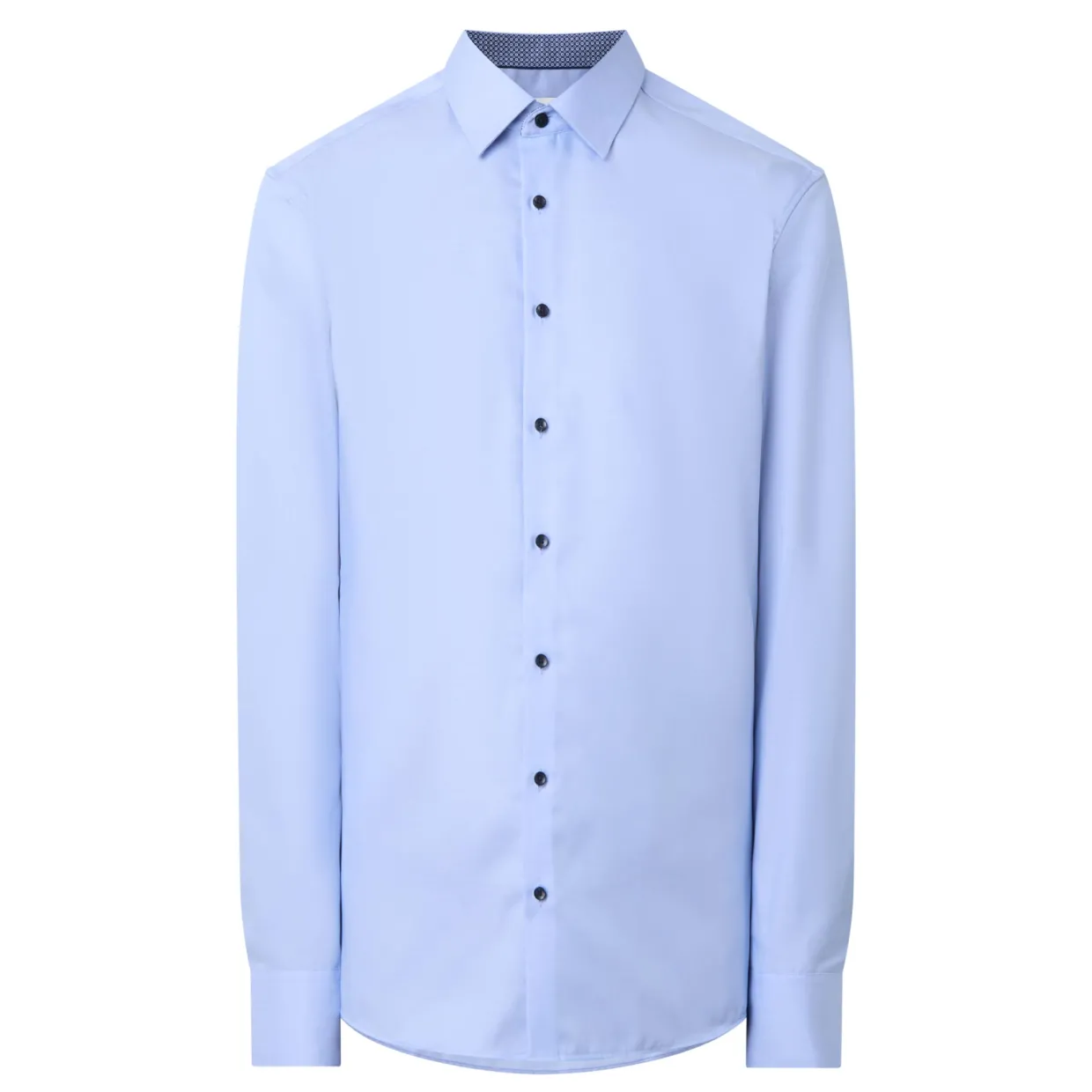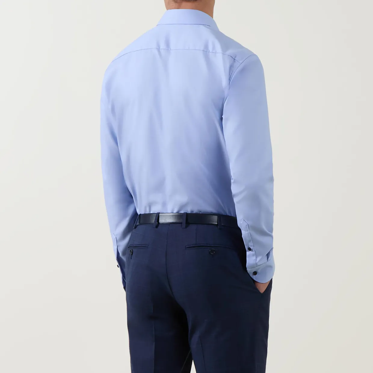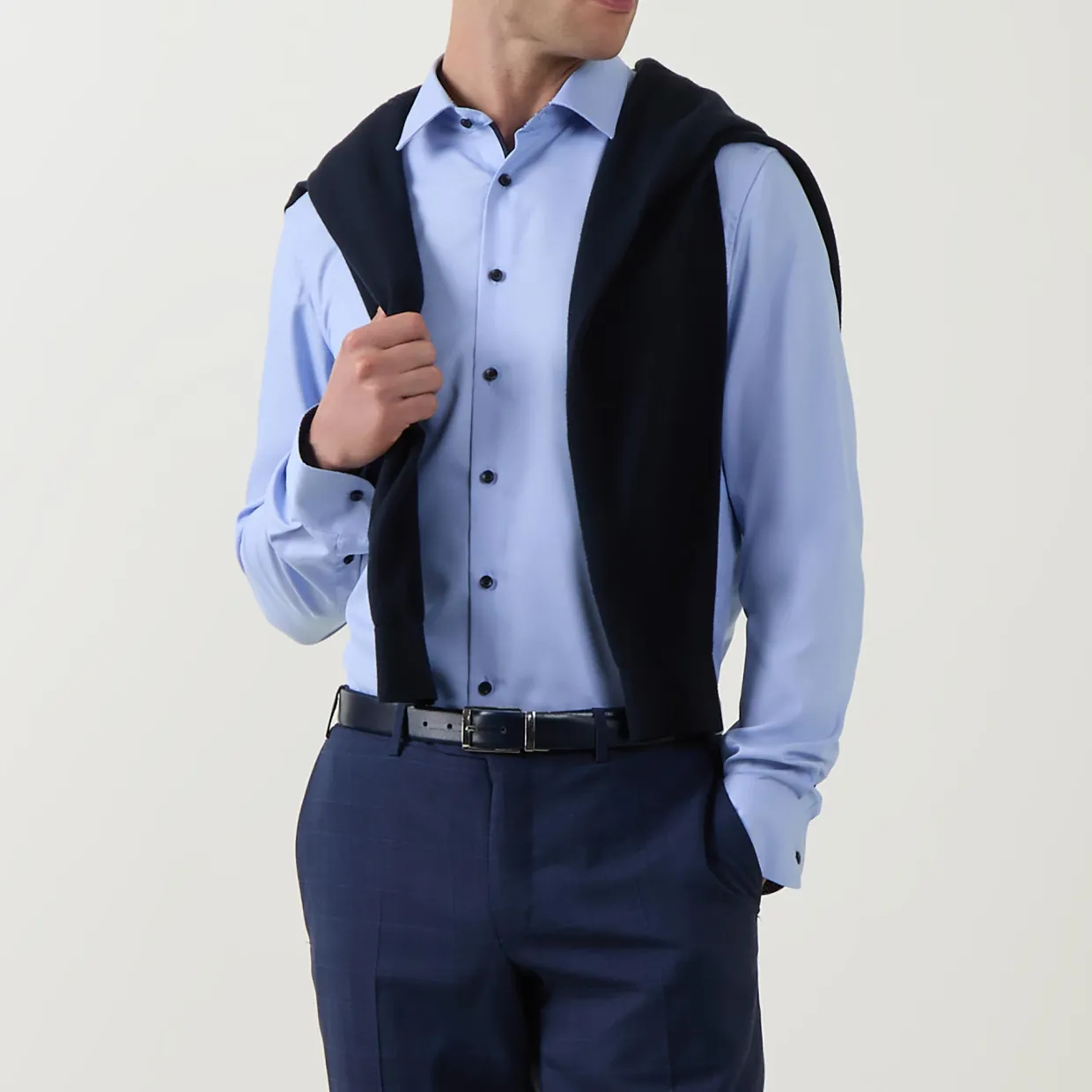 - Contrast trim, pointed collar, long sleeves, button fastenings, curved hemline, single cuffs