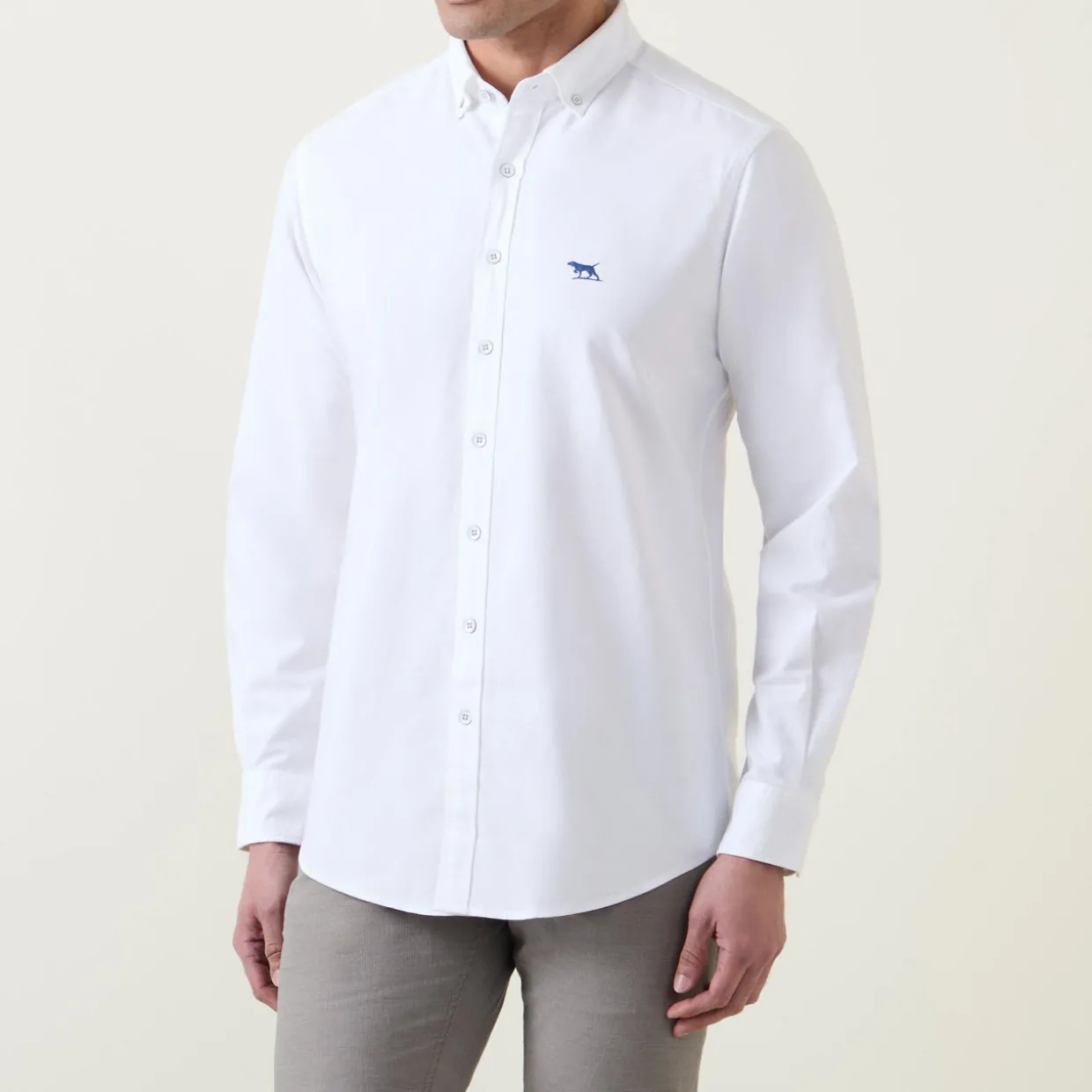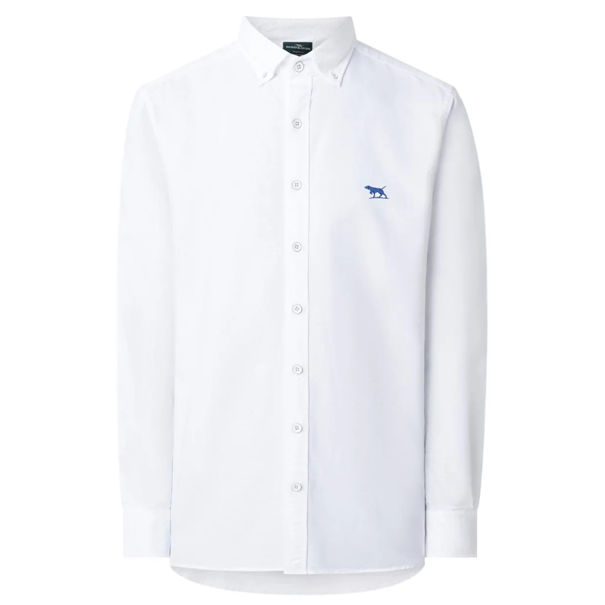 - Button-down collar, long sleeves, round buttoned cuffs, front button placket, box pleat, locker loop, logo detail