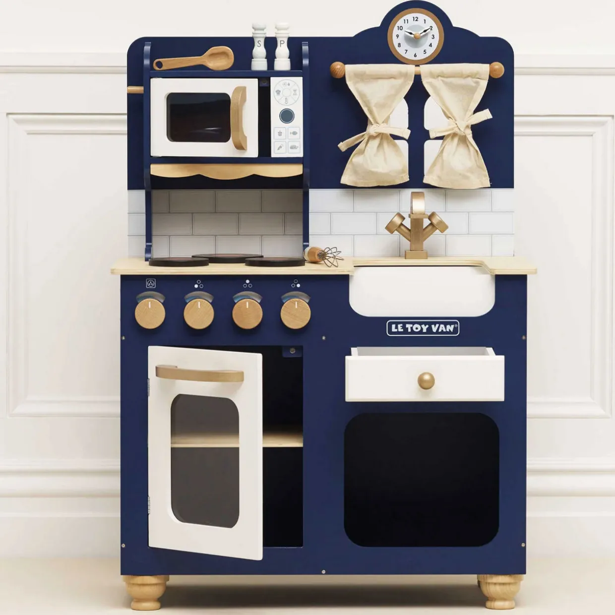 - Kitchen includes an oven with opening door, hob with realistic turning knobs, a sink, microwave and a sweet window and clock with movable wooden hands, also includes kitchen utensils including a whisk, a spoon, a salt and a pepper