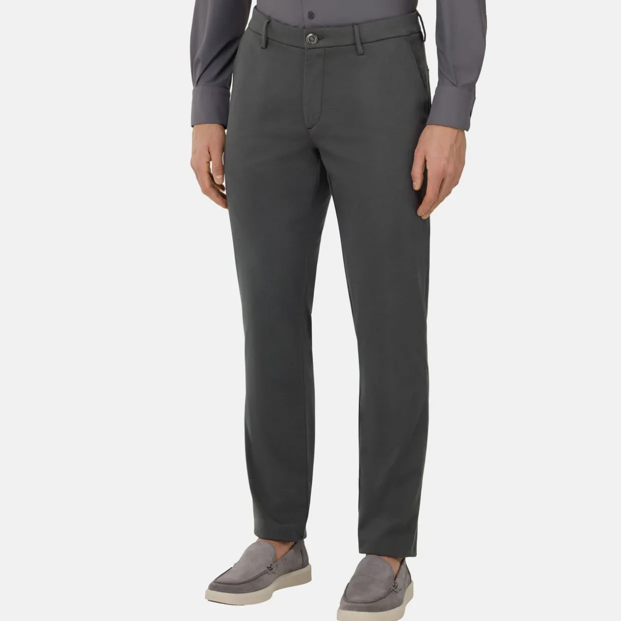 - Mid-rise, slim leg, belt loops, concealed fly and button fastening, two side slit pockets, two rear welt pockets, clean hems, pressed creases, logo tag, smooth finish