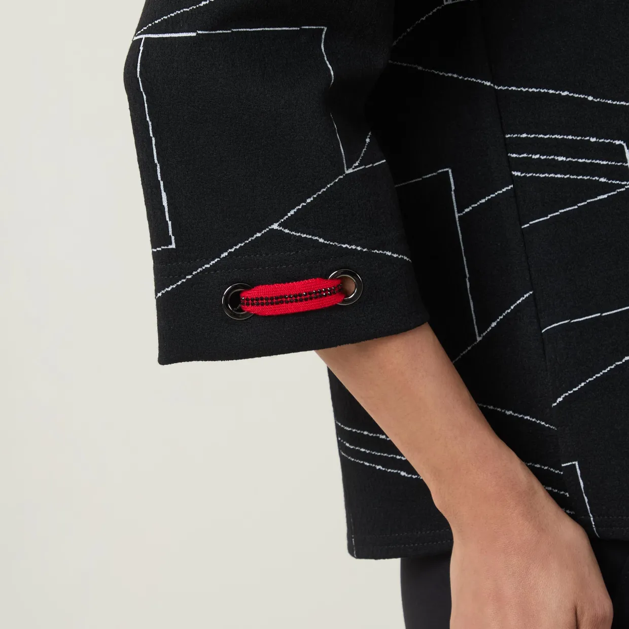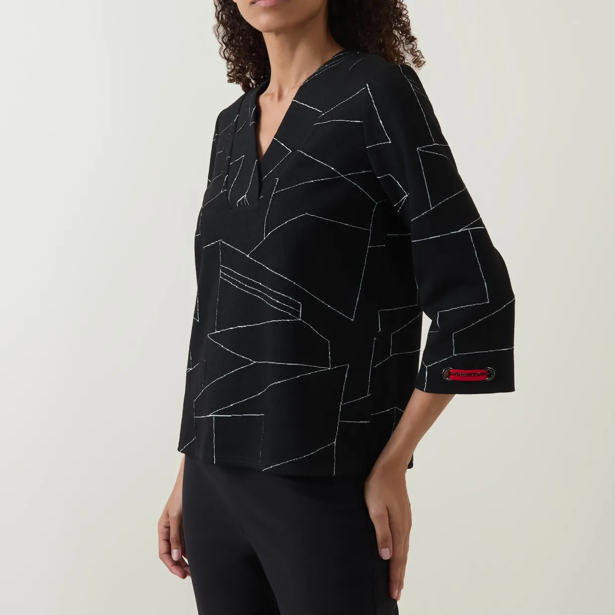 - Mid-length sleeves, V-neckline, embellished panelled design, tonal stitching, embellished cuffs, straight hemline, smooth fabric
