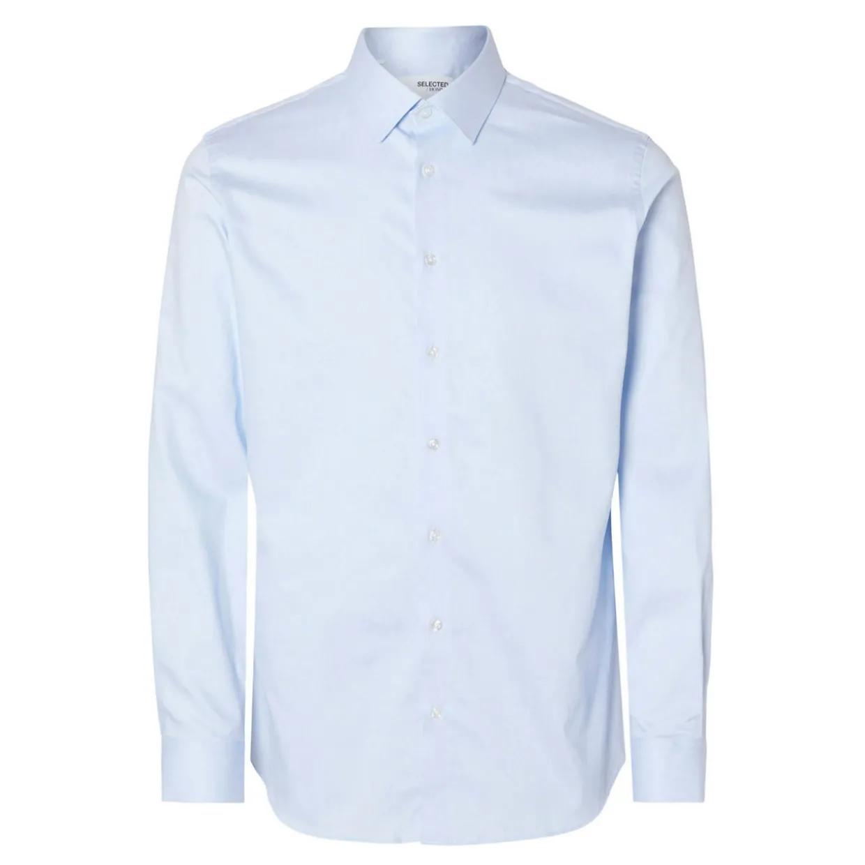 - Pointed collar, button fastening, curved hemline, long sleeves, buttoned cuffs