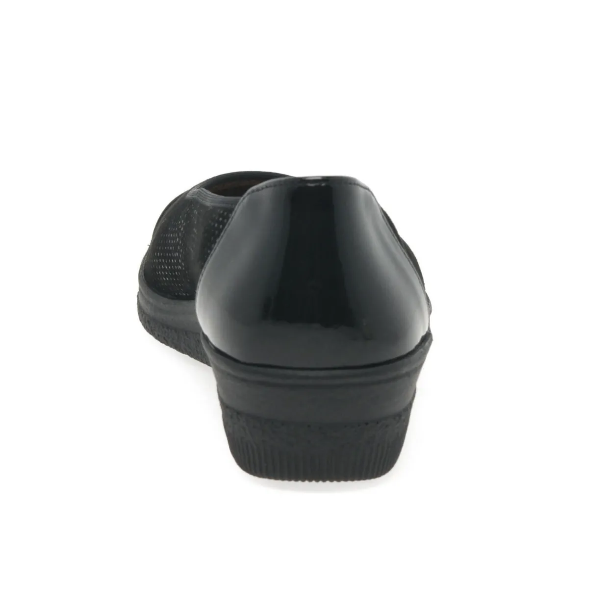 - Low wedge heel, contrast patent toe and heel cap, slip-on style, fine polka-dot finish