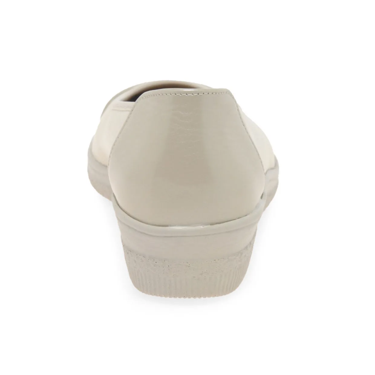- Round toe, wedge heel, slip-on style, patent toe cap and heel panel