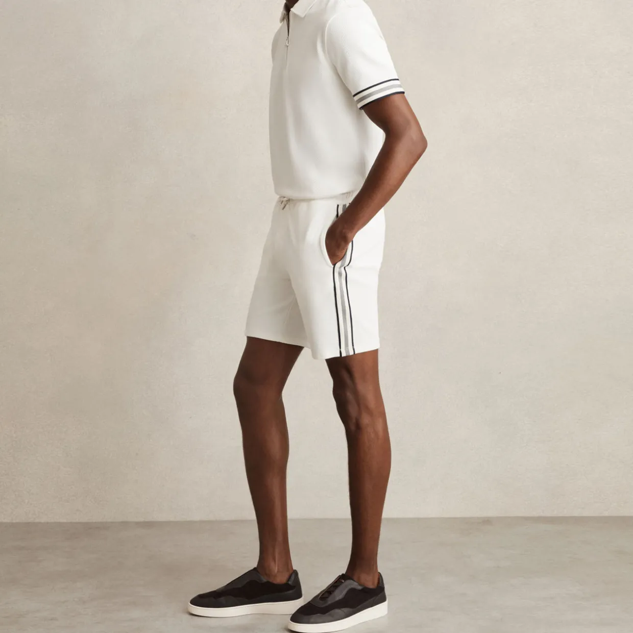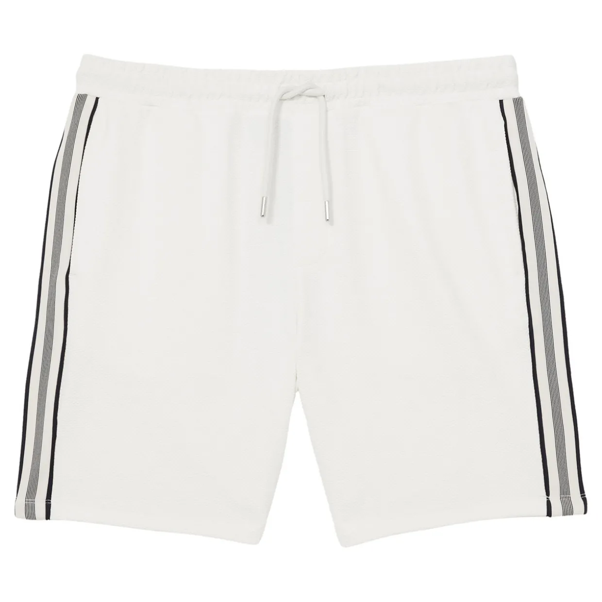 - Textured finish, striped tape, sporty touch, elasticated drawstring waist, side slip pockets
