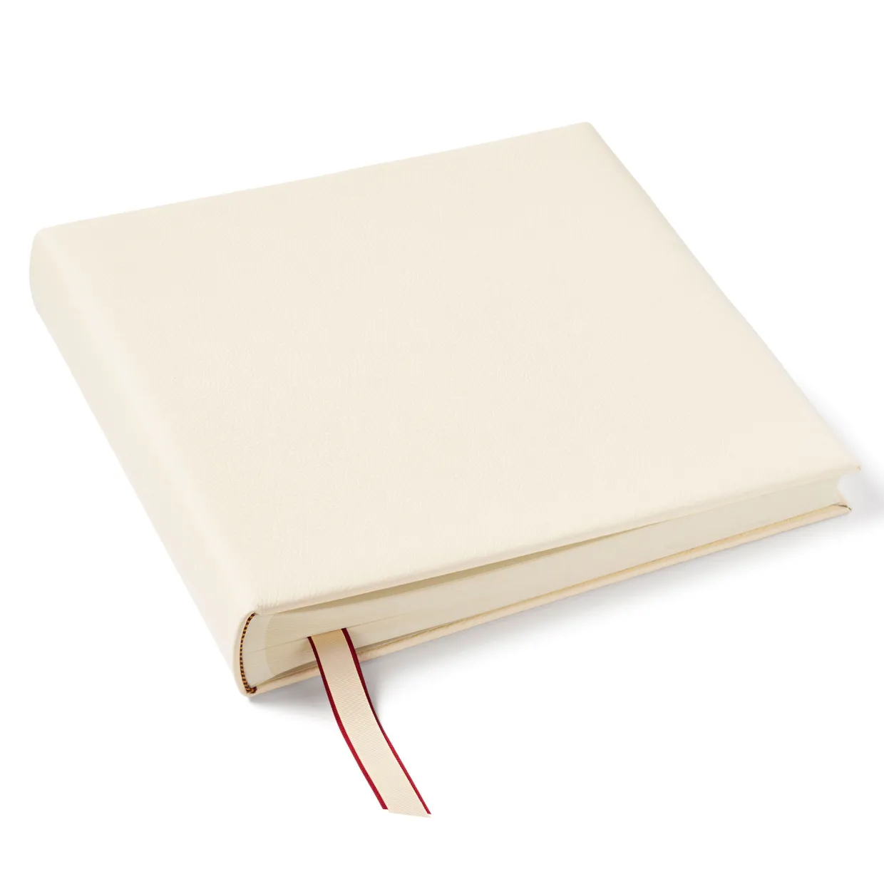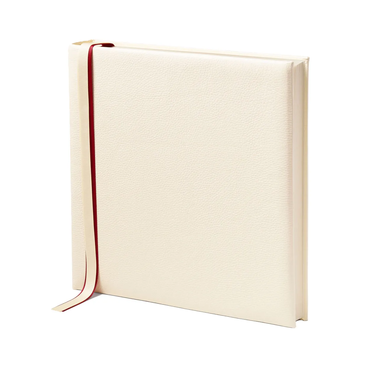 - Square shape, handbound, full-grain leather, 50 acid-free cream card pages, pH-balanced tissue interleaving sheets, signature grosgrain ribbon page markers