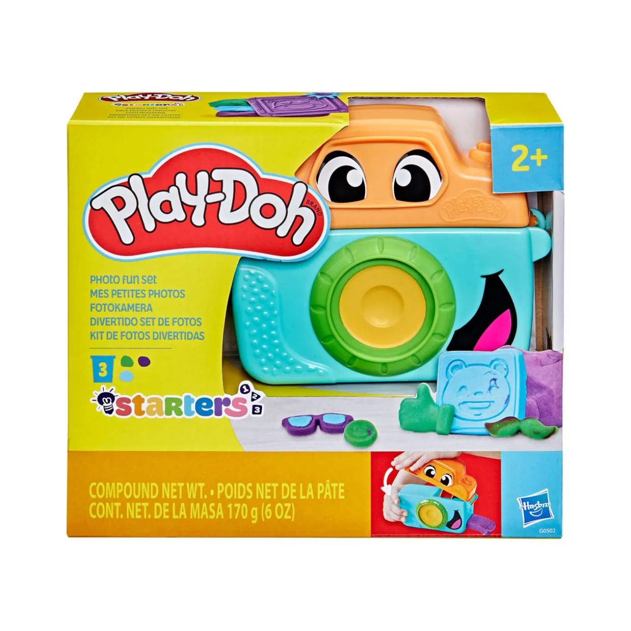 - Camera tool, playmat, five face stampers, roller, knife, three cans of Play-Doh Brand Modeling Compound