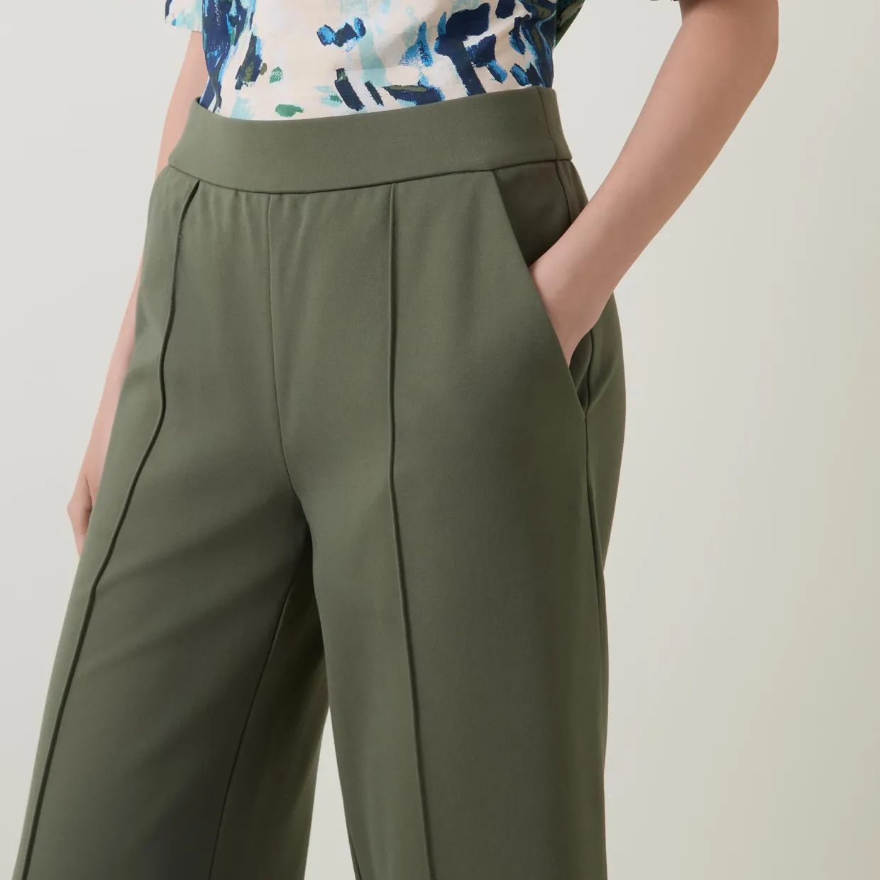 - Elasticated waistband, raised seams, wide-cut leg, side entry pockets