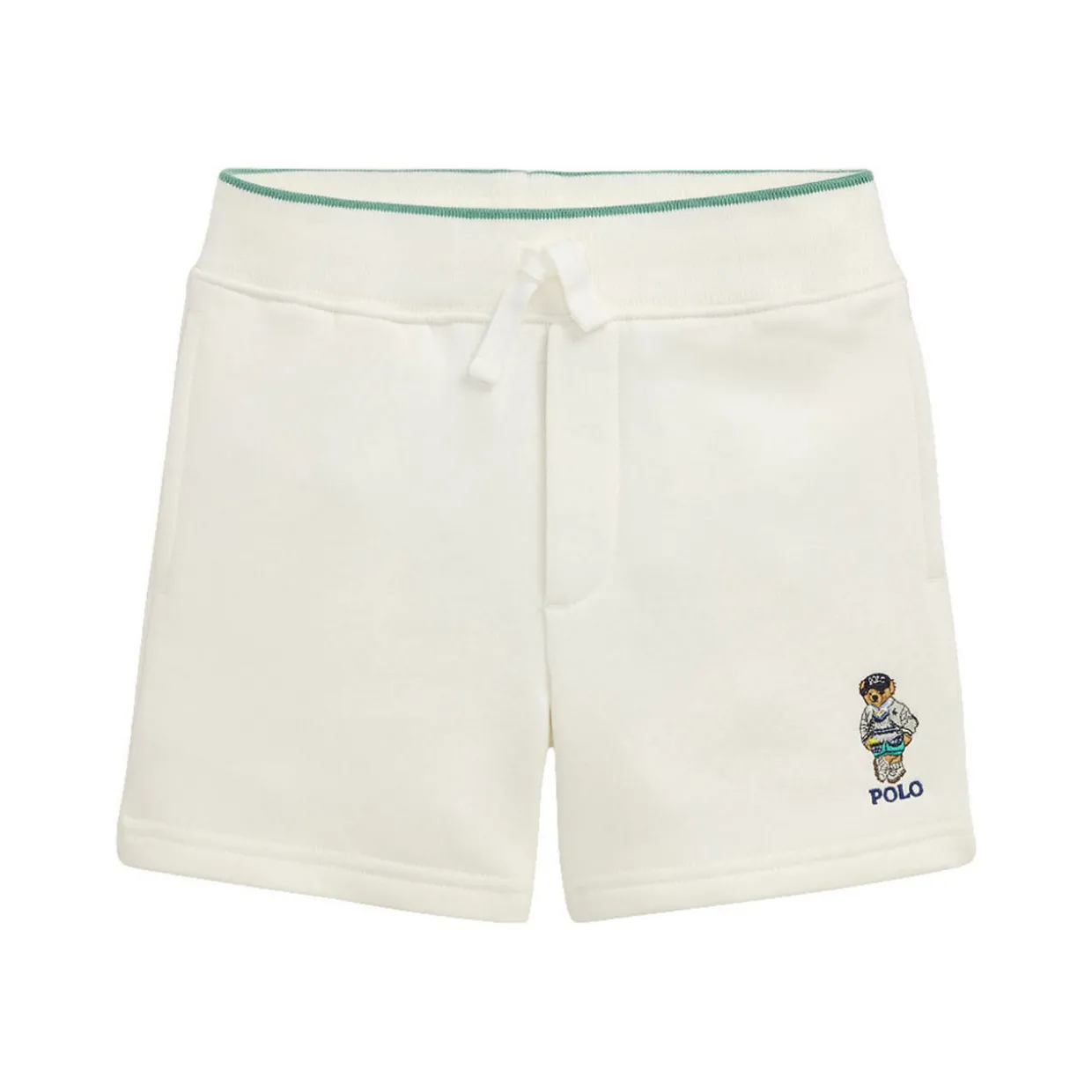 - Ribbed drawstring waistband, faux fly, side on-seam pockets, Polo Bear and script logo embroidered at the left hem