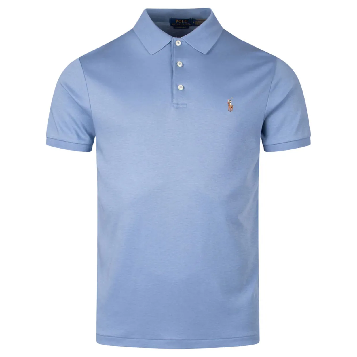 - Cotton interlock fabric, ultra soft finish, ribbed Polo collar, three-button placket, short sleeves, ribbed armbands, vented hem, signature embroidered Pony detail