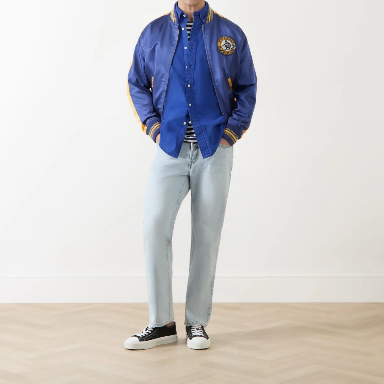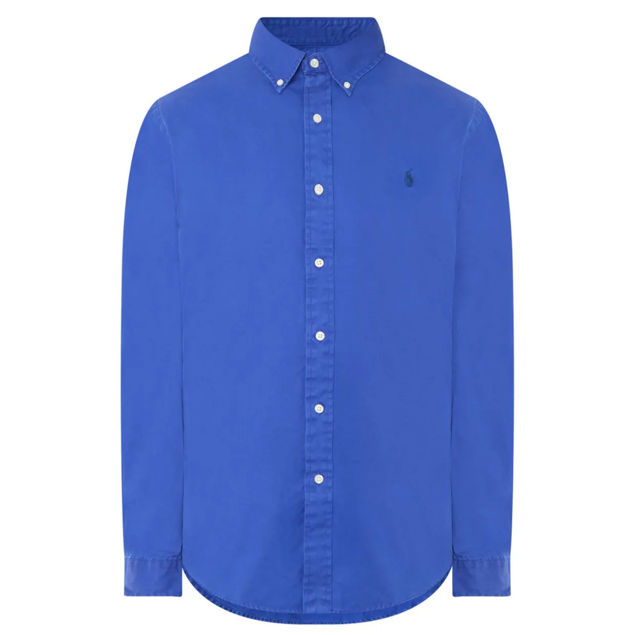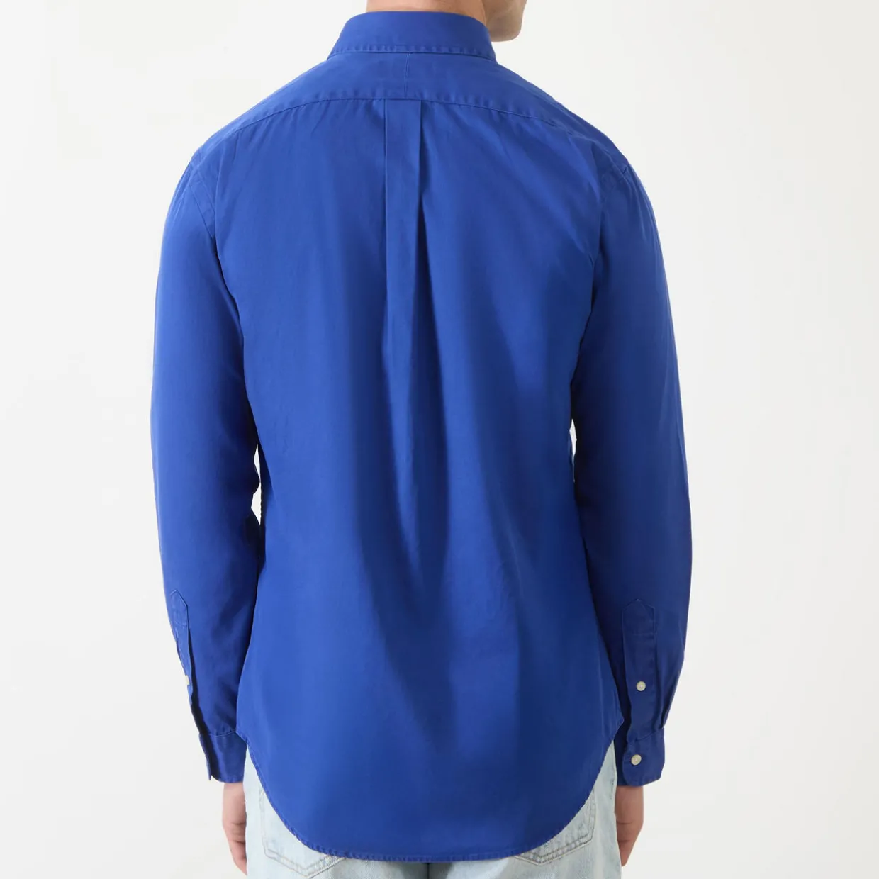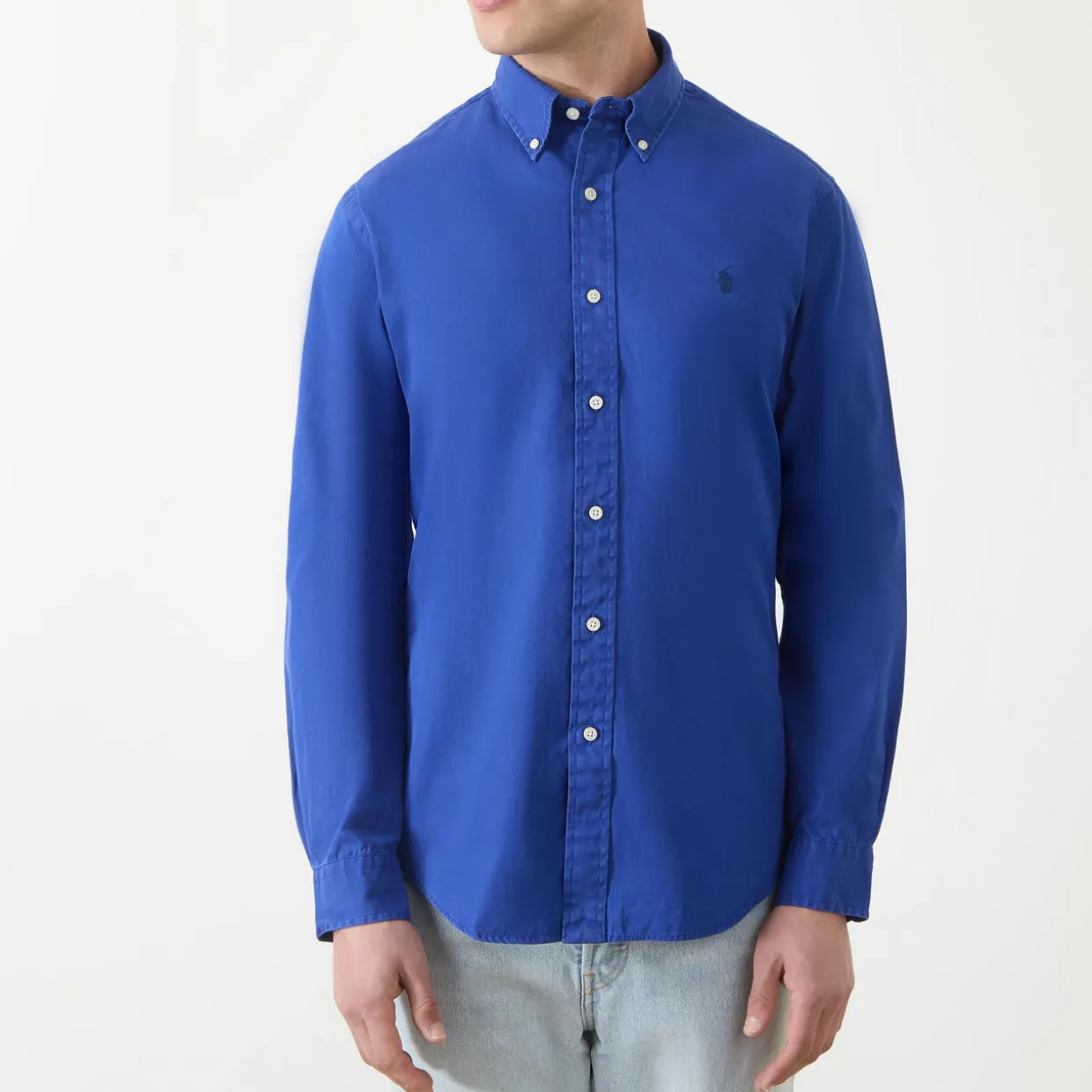 - Button-down collar, long sleeves, buttoned cuffs, front button placket, curved hemline, polo player logo embroidery on the chest