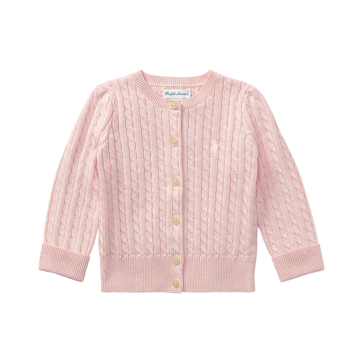 - Signature embroidered Pony at the left chest, crewneck, buttoned placket, grosgrain trim along the under placket, puffed long sleeves with folded rib-knit cuffs, rib-knit hem
