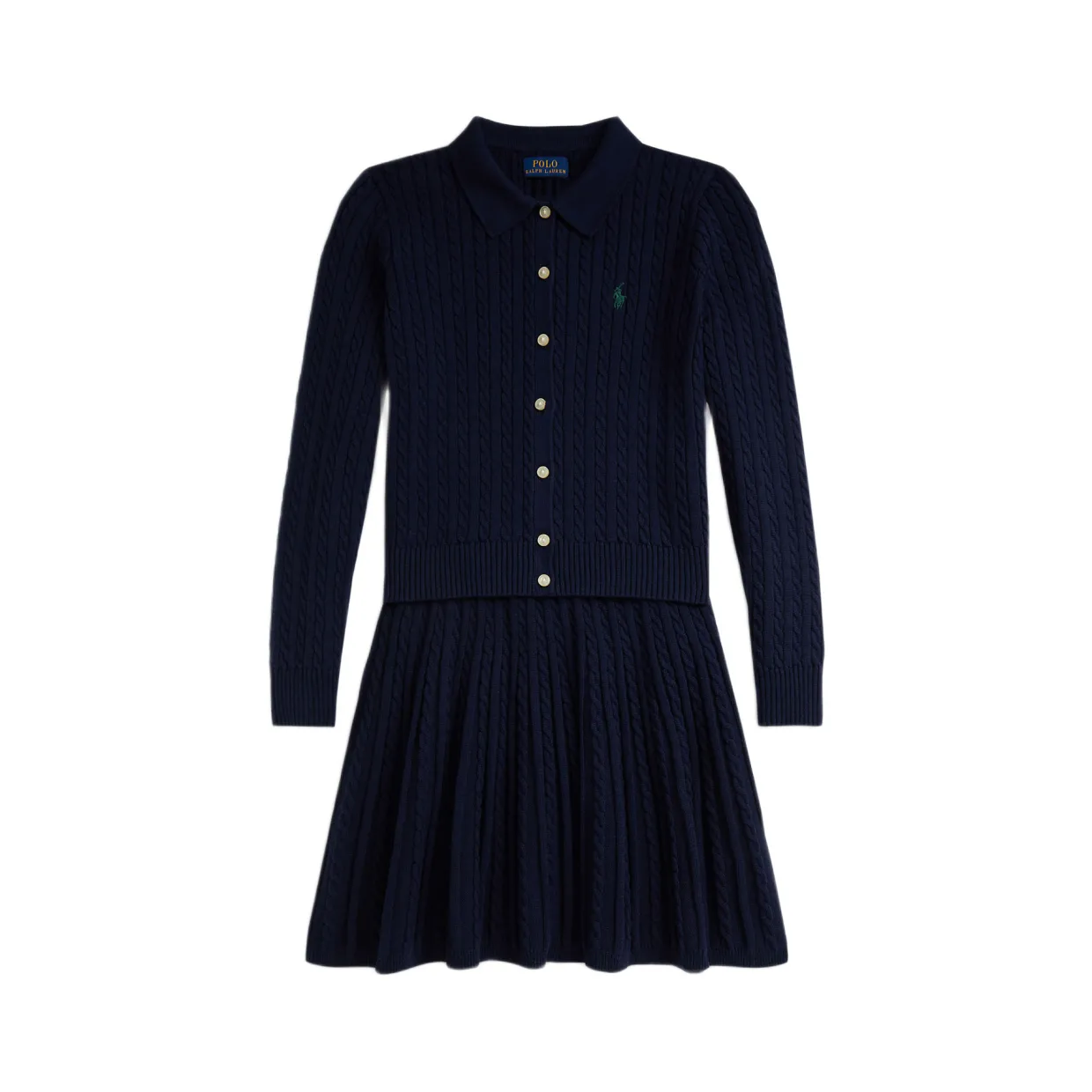 - Cardigan: Signature embroidered Pony logo, mini-cable knitted pattern, rib-knit Polo collar, buttoned placket, long sleeves, rib-knit cuffs, rib-knit hem. Skirt: Rib-knit waistband, rib-knit hem, mini-cable knitted pattern, mini length