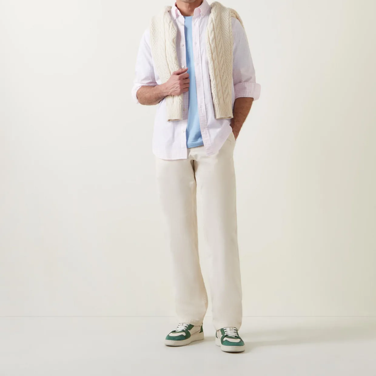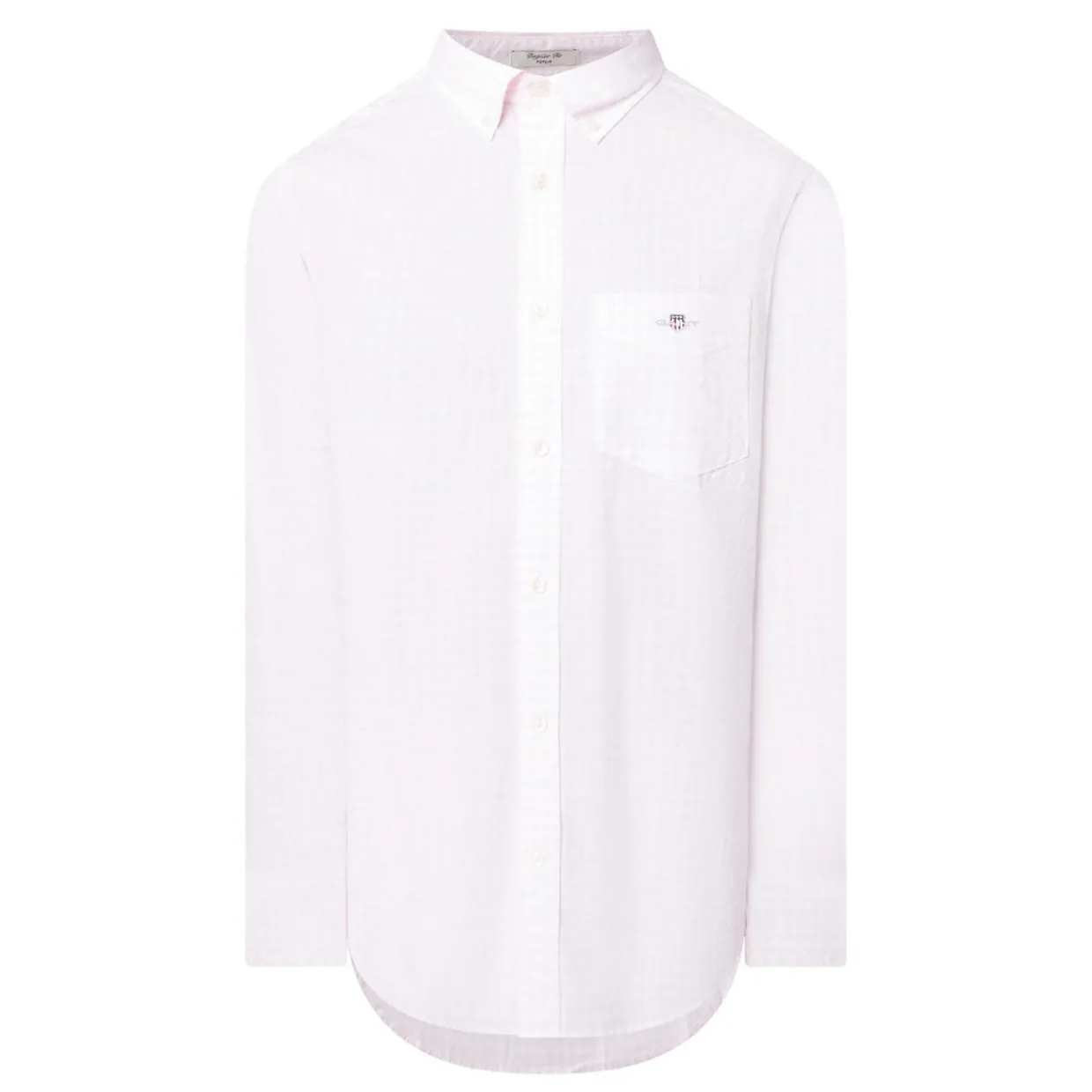 - Button-down collar, long sleeves, button placket, chest pocket with logo shield embroidery, check pattern, single-button cuffs, curved hemline, smooth fabric