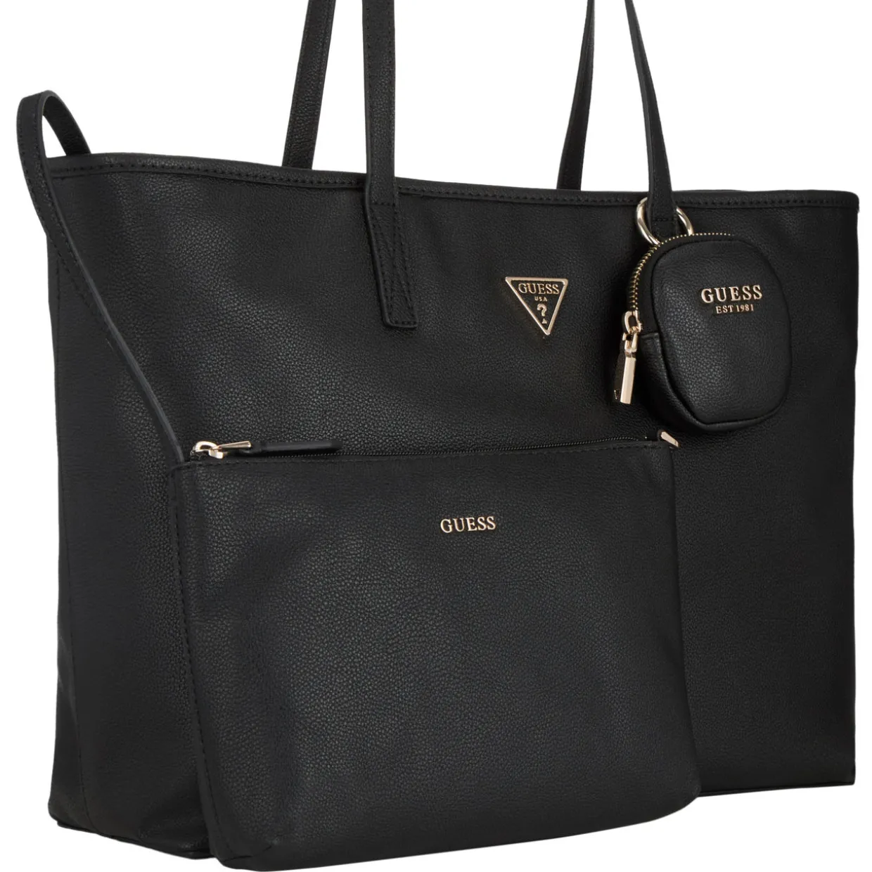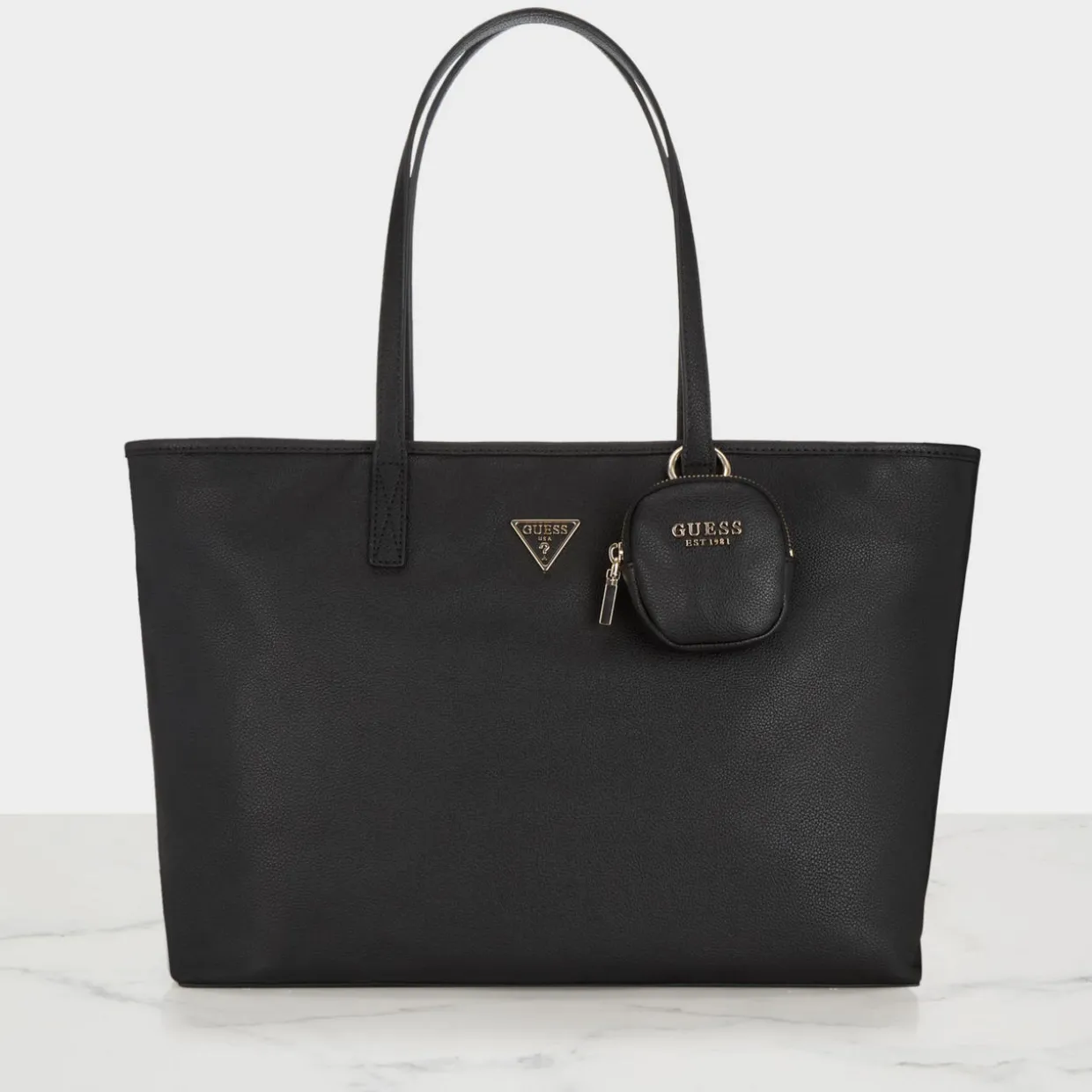 - Two top carry handles, secure zip-fastening closure, front triangle logo plaque, attached pouchette with logo lettering, back zip-fastening pocket