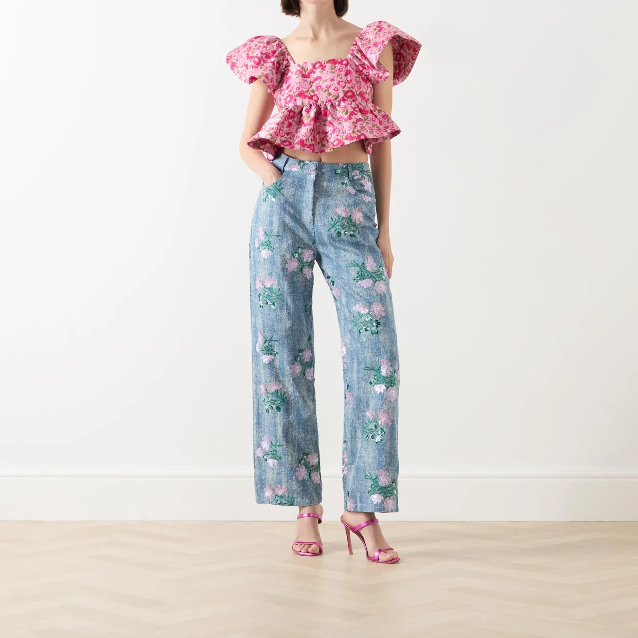 - Floral jacquard design, square neckline, cropped length, babydoll style, peplum hemline, shirred back
