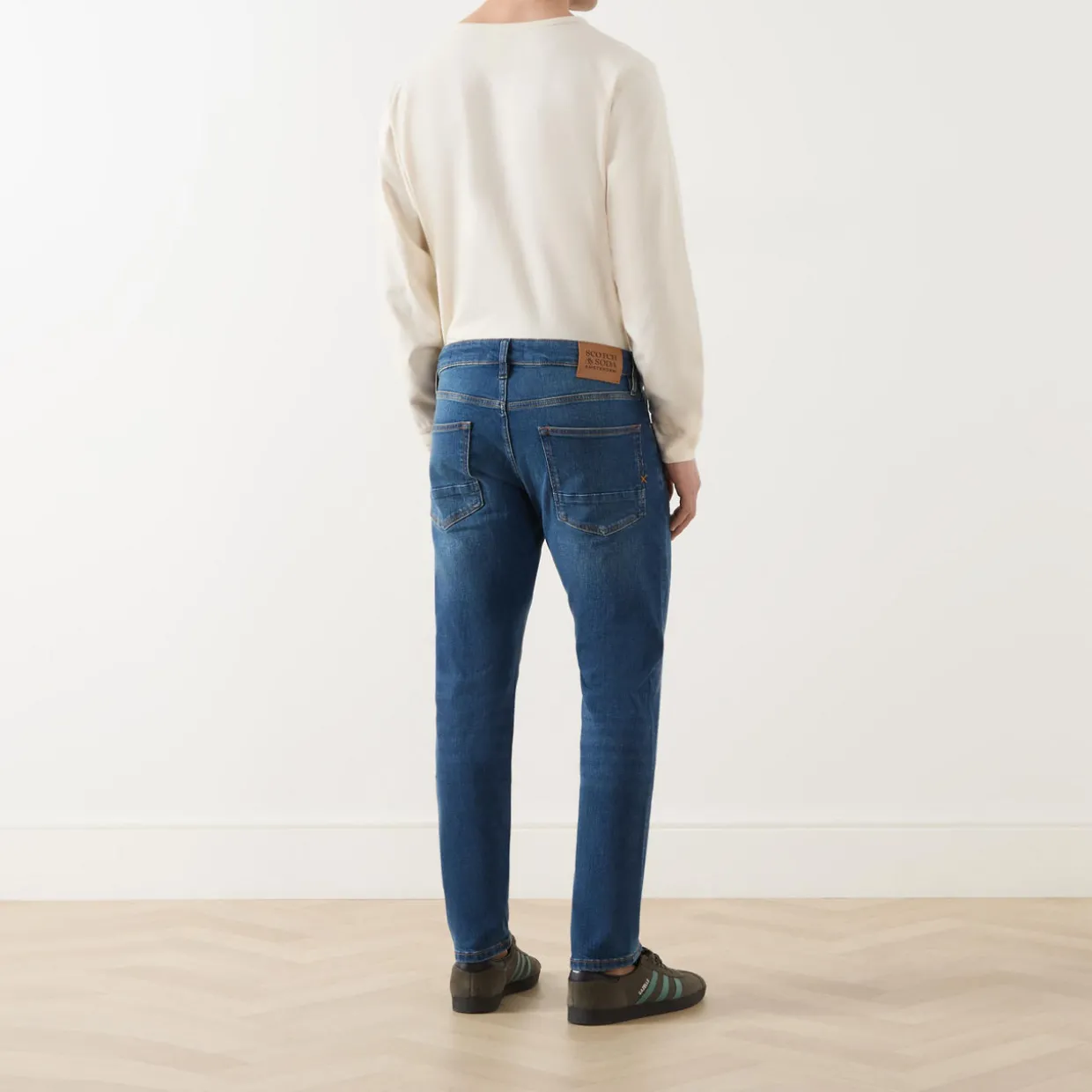 - Slim straight leg, mid-rise waist, five-pocket detail, zip fly and button fastening, belt loops, logo patch