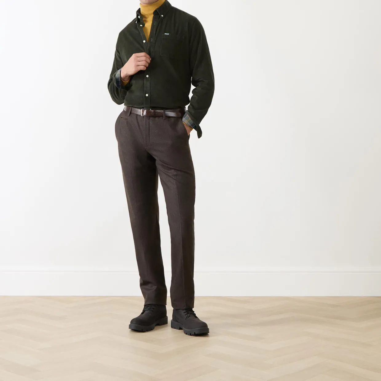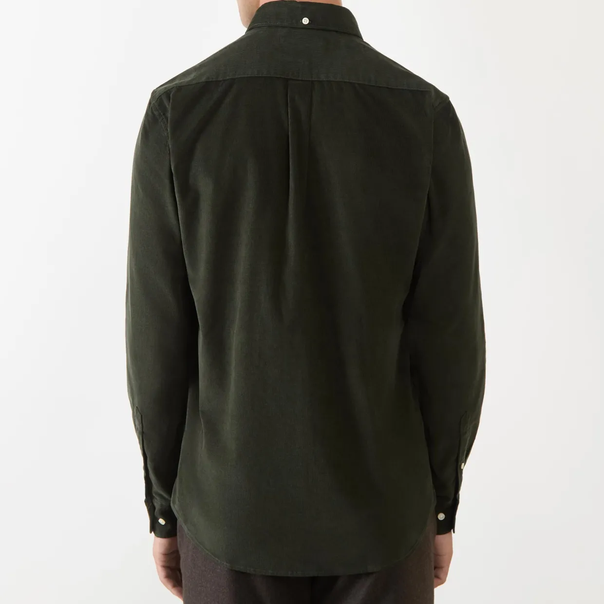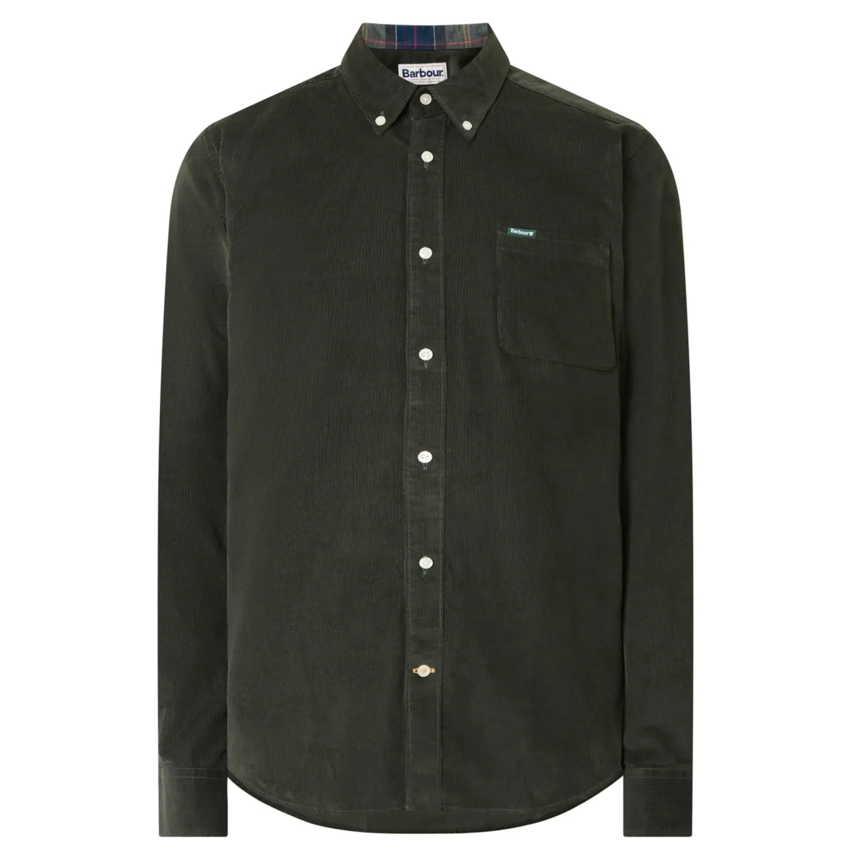 - Long sleeves, corduroy texture, button-down collar, curved hemline, logo detail, button fastenings, chest pocket