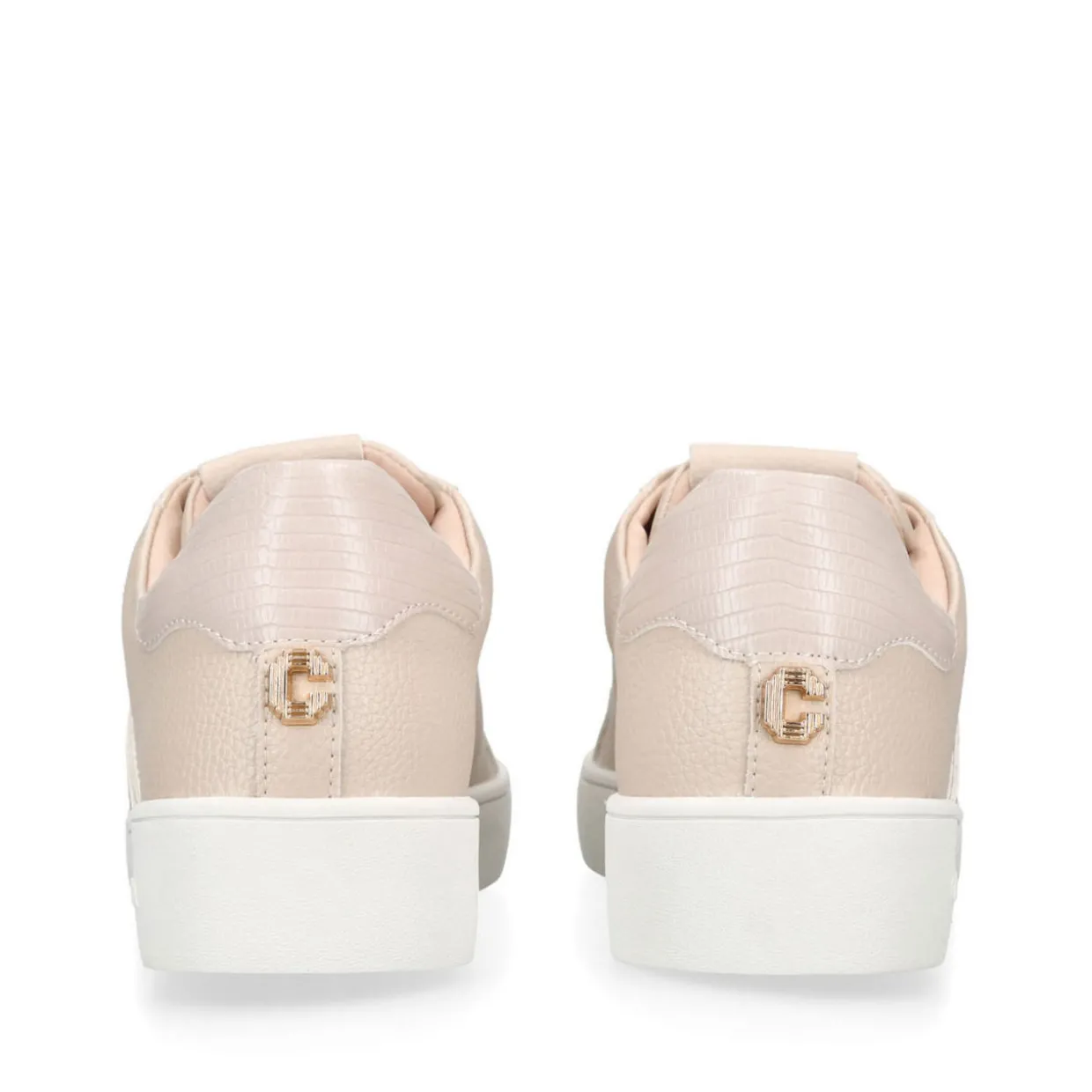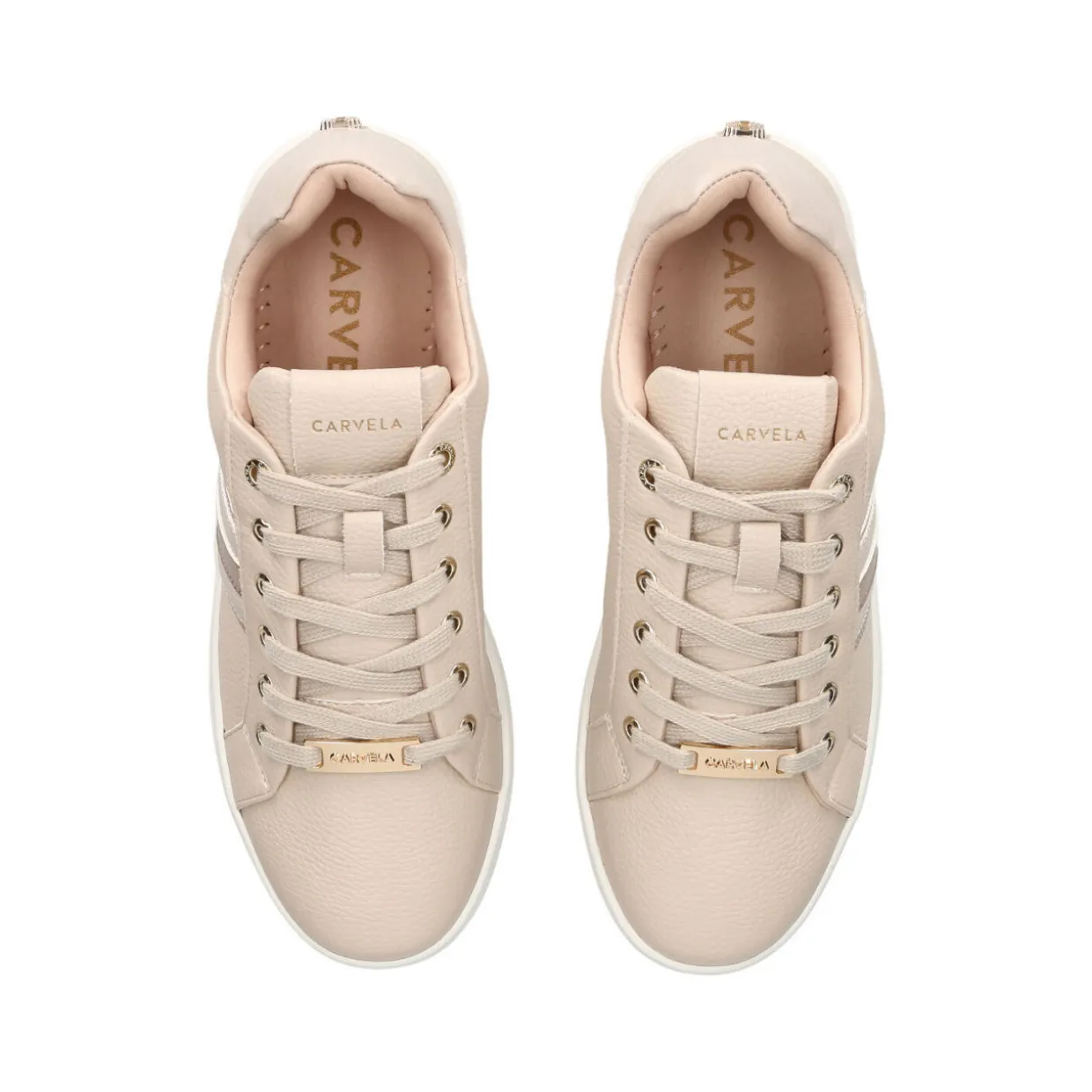- Low top, lace-up style, rounded toe, gold-tone branding, metallic striped detail, Icon C stud