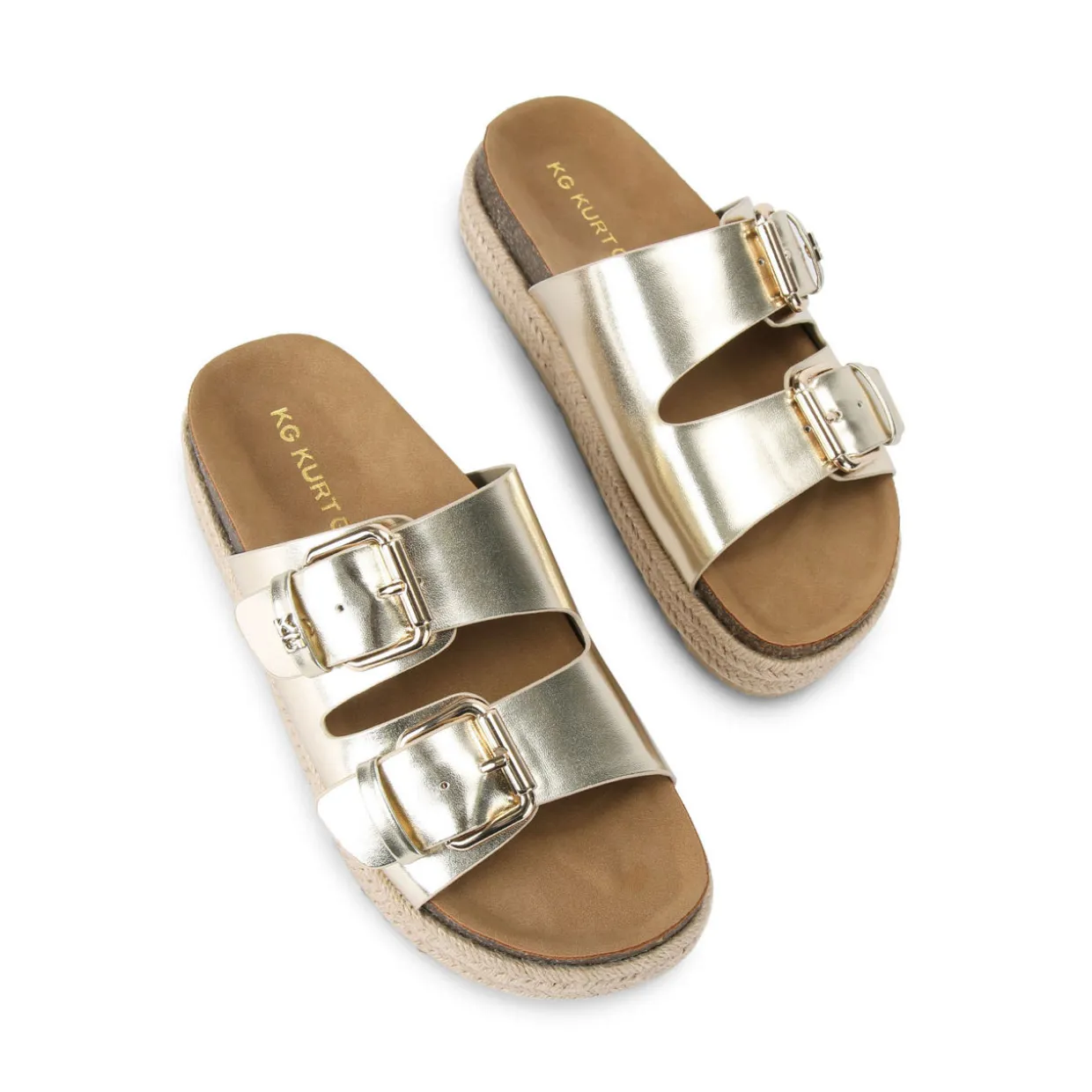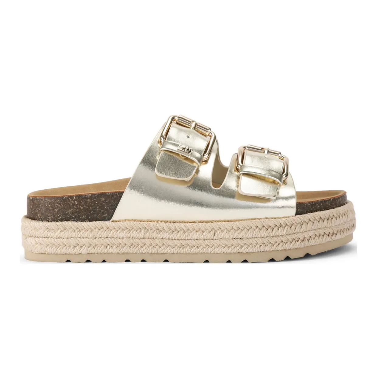 - Two foot straps, gold-tone buckle fastenings, stepped footbed, rope sole