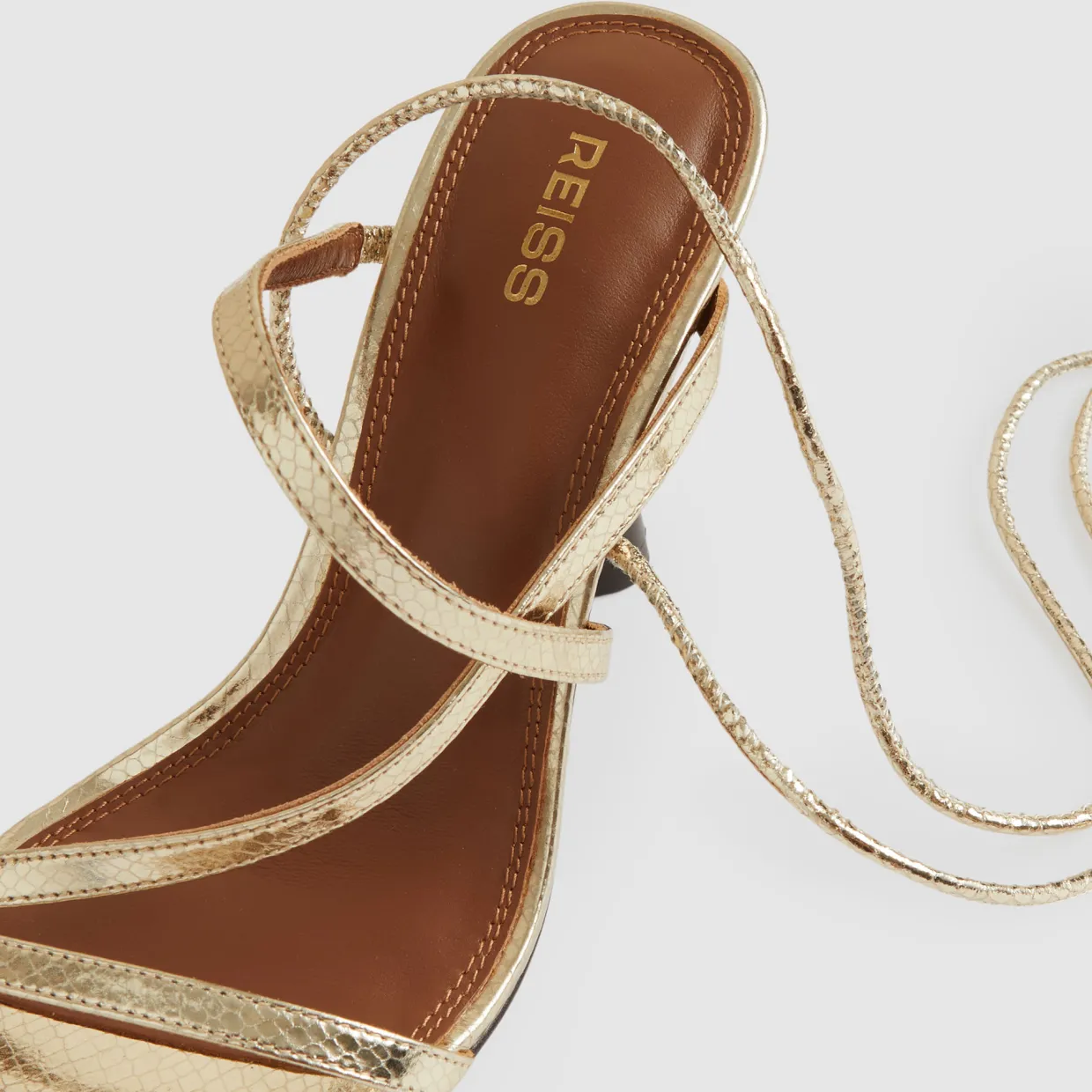 - Metallic leather, snakeskin effect, cord wrap, tie-ankle straps, tapered heel, squared open toe