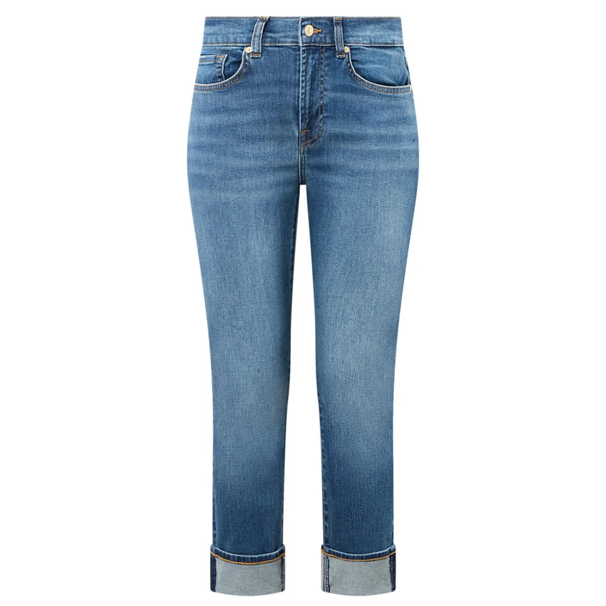 - Zip-fly and button fastening, belt loops, five-pocket design, contrast stitching, rear logo patch, whiskering and faded detailing, turned-up cuffs, skinny-cut leg, smooth denim finish