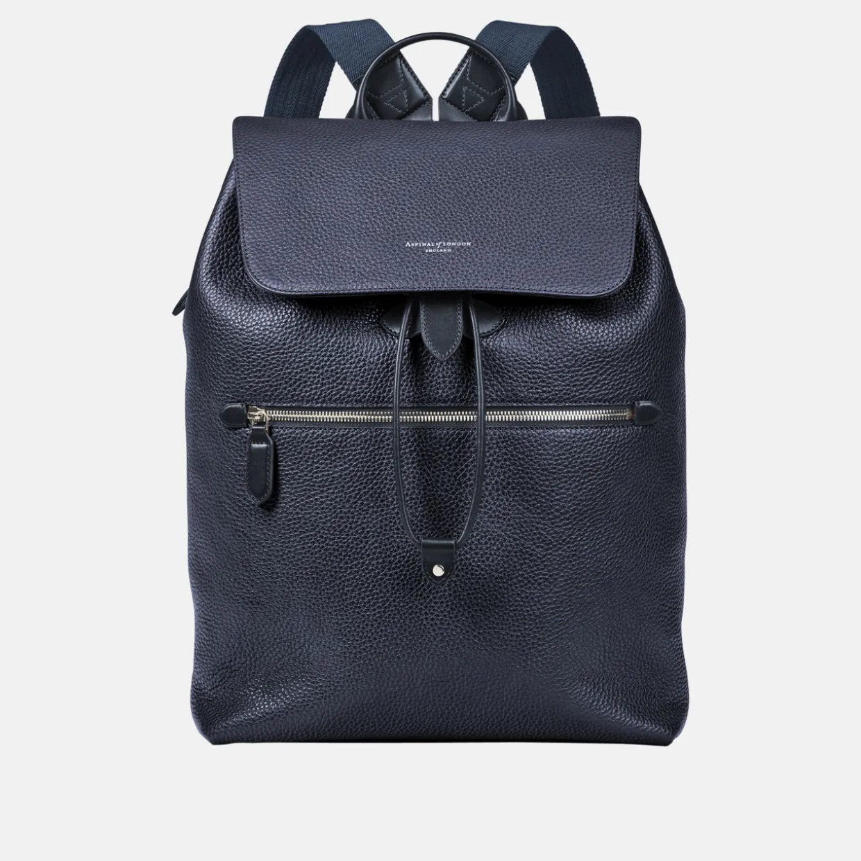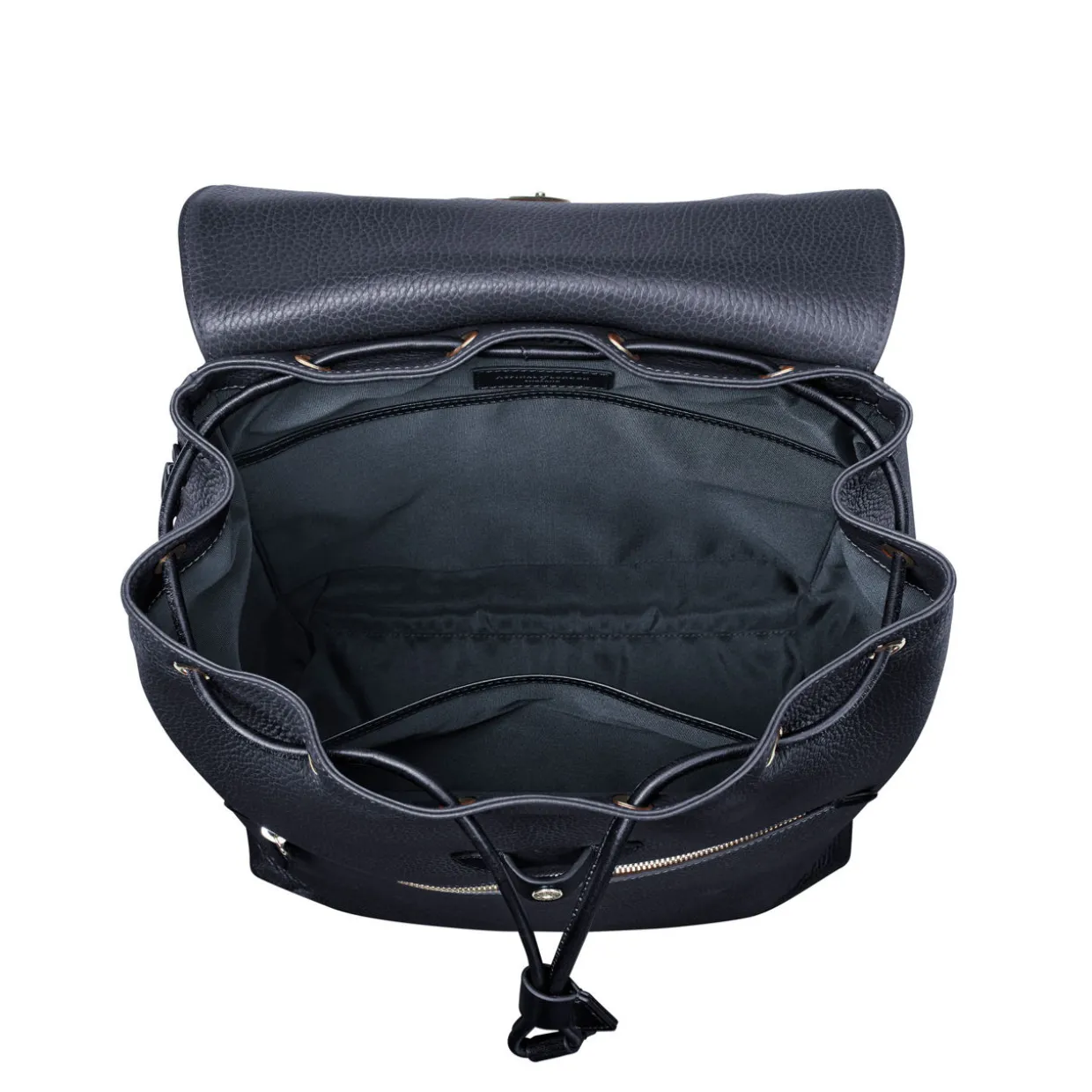 - Flap closure with adjustable drawstring closure and snap button fastening, adjustable webbing straps, two exterior pockets with zip fastenings, silver-tone hardware, logo lettering, grained leather texture