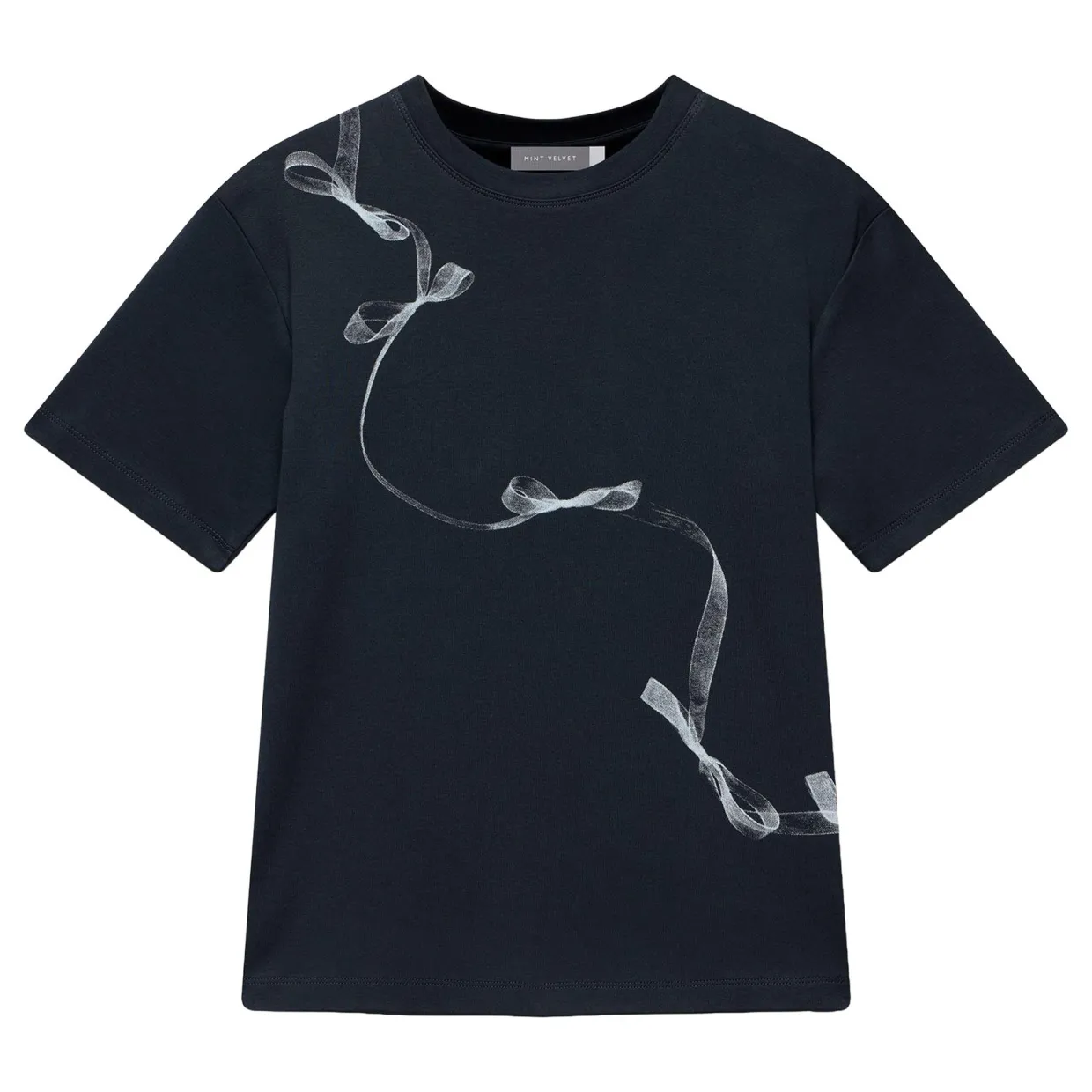 - Crew neckline, short sleeves, ribbon print motif
