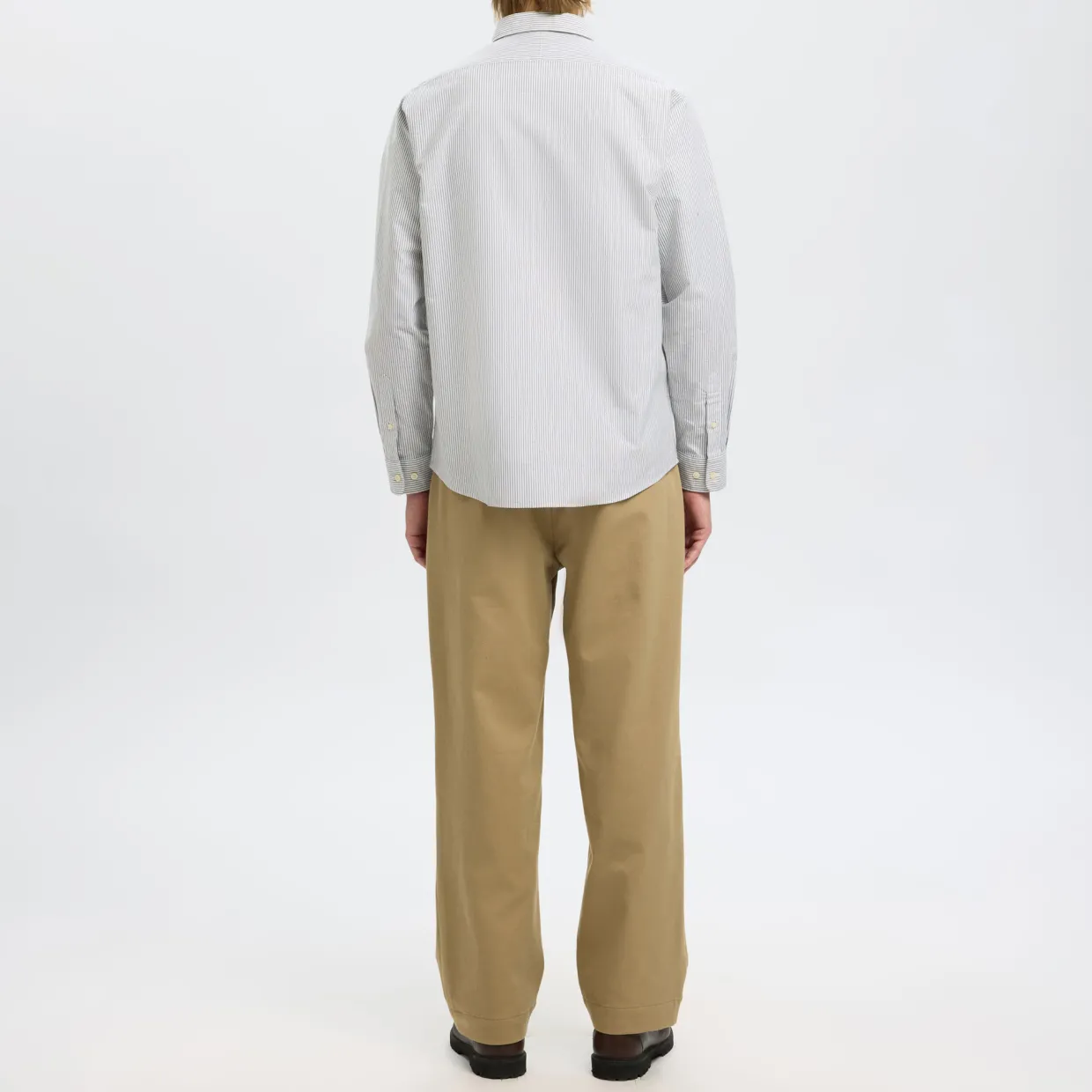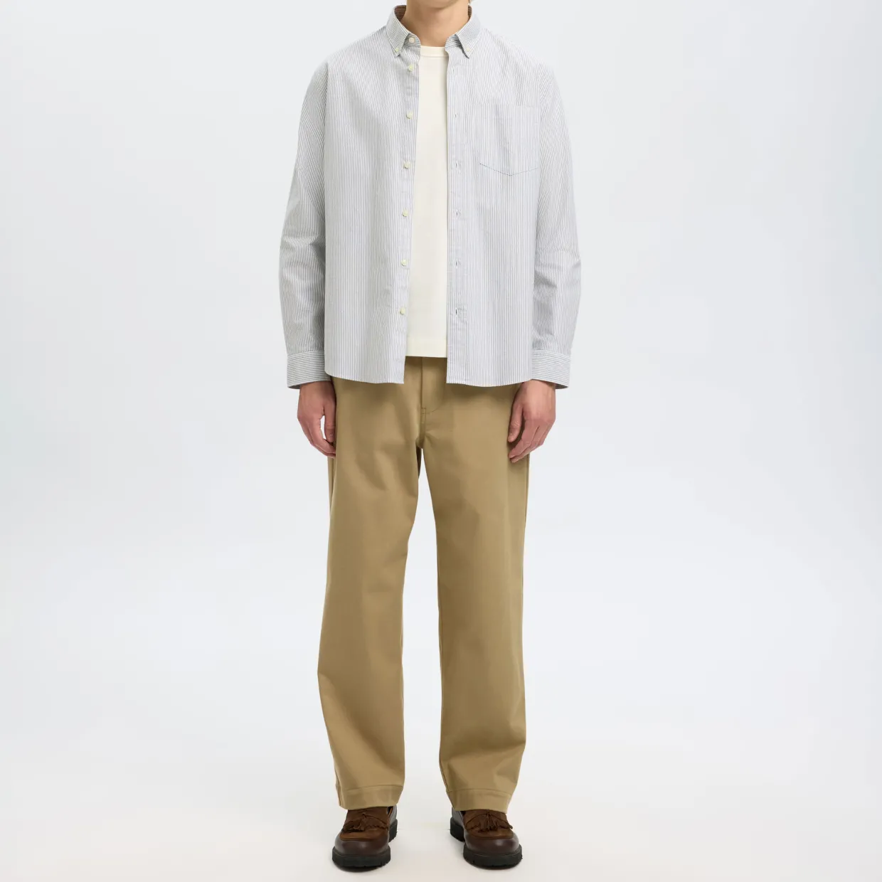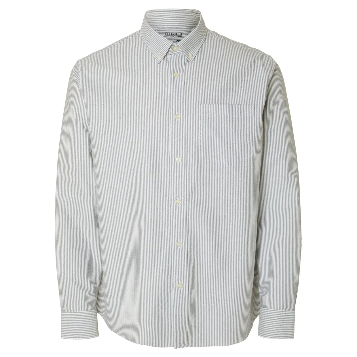 - Buttoned cuffs, Oxford style, shirt collar, long sleeves, button fastening, chest pocket, curved hem, stripe pattern
