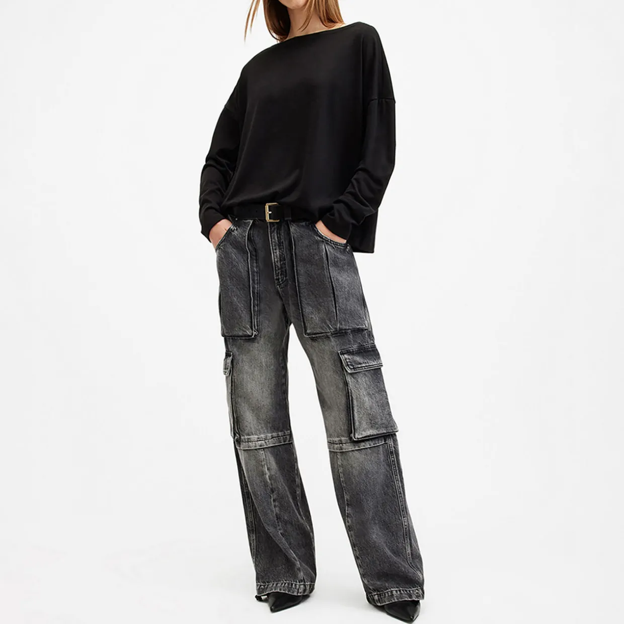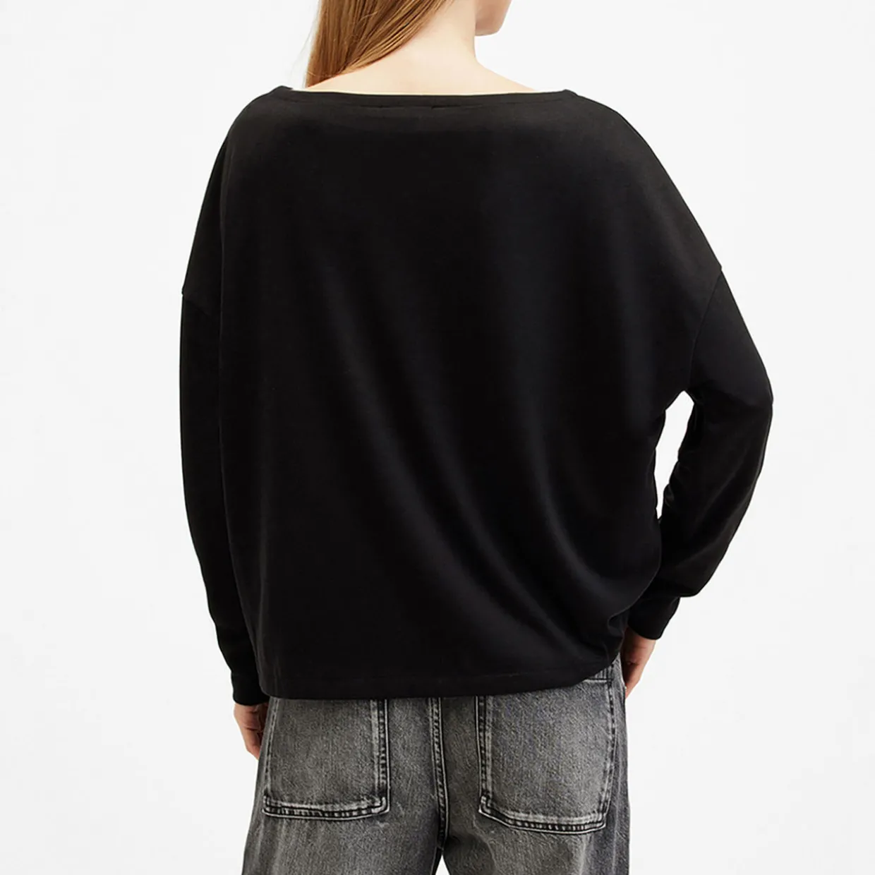 - Boat neckline, dropped shoulders, long sleeves, straight hem, fine-knit construction