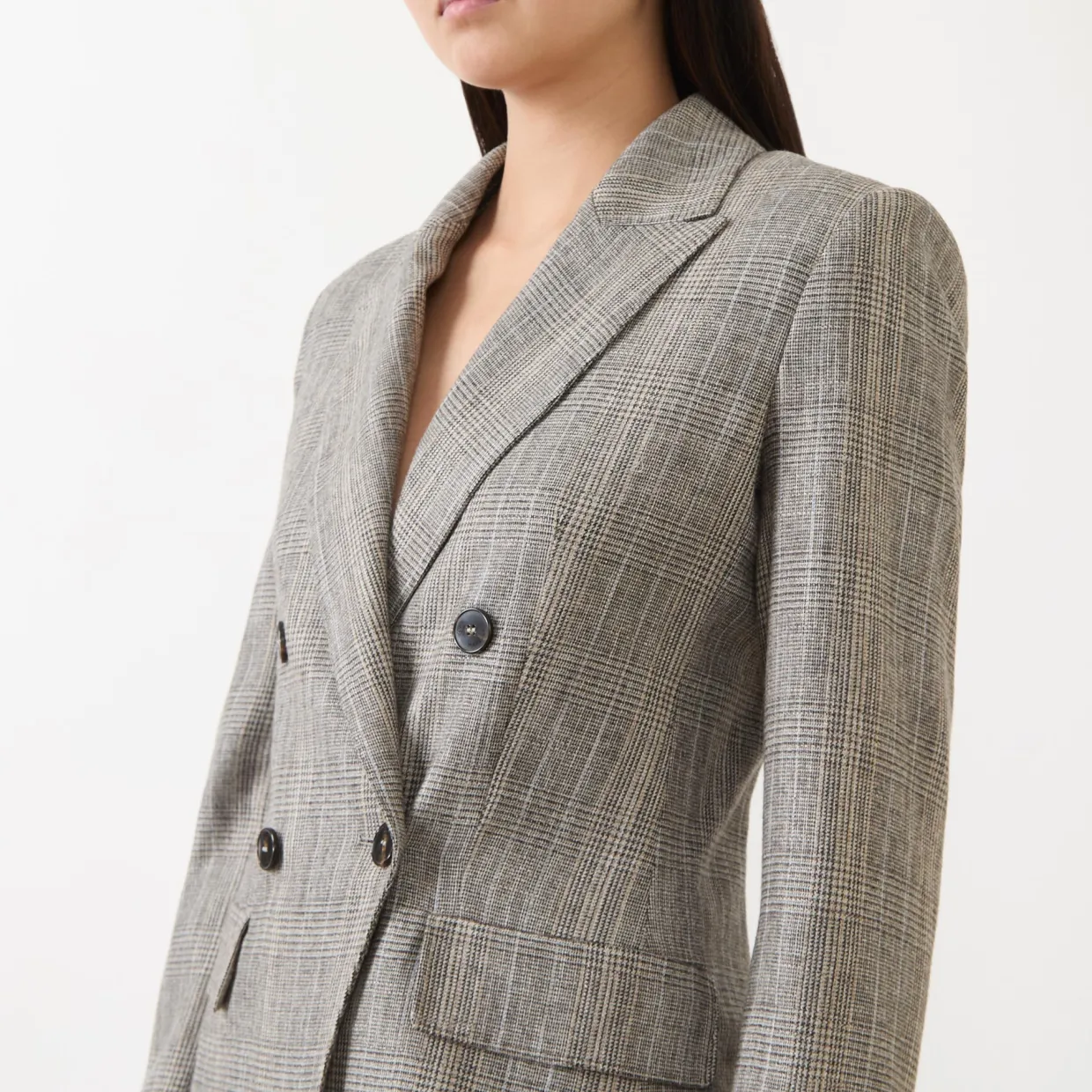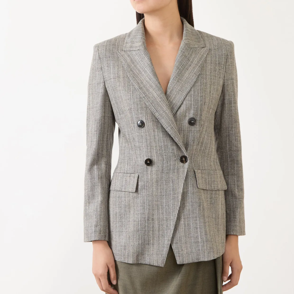 - Double-breasted, peaked lapels, button fastening, vent at rear, flap pockets, Prince of Wales pattern
