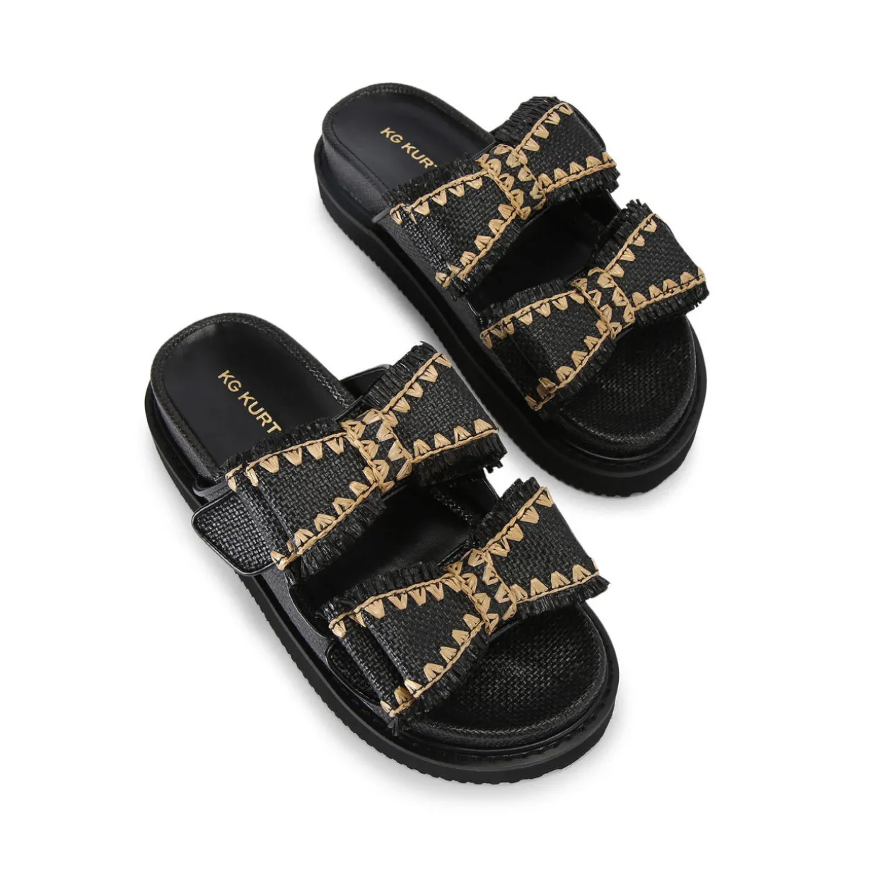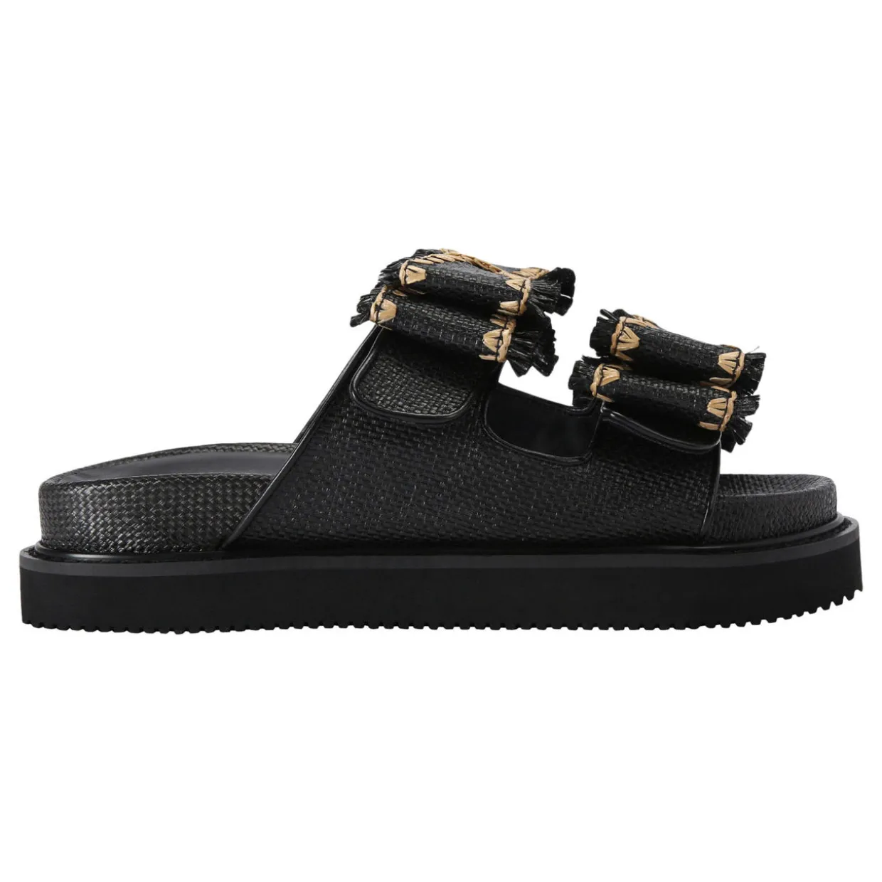- Slip-on style, two statement raffia bows on the straps, platform sole