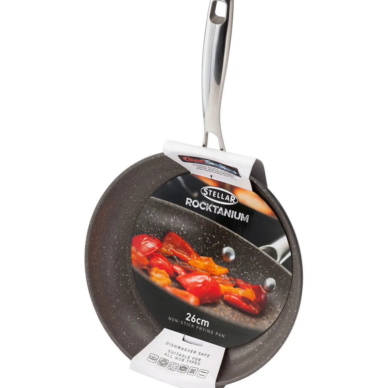 - Ultra hard PFOA-free QuanTanium non-stick reinforced with titanium, riveted stainless steel handle, curved shape that feels comfortable in the hand, wishbone design to help reduce heat in the handle, loop at the end for hanging and rivets to ensure it never comes loose