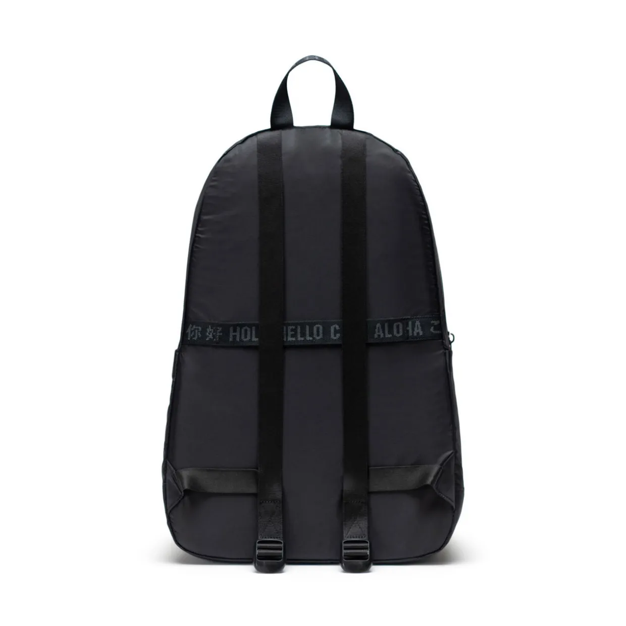 - Packable design, folds into an internal pocket for easy storage, EcoSystem™ 70D Ripstop Fabric, top zip fastenings, adjustable smooth webbing shoulder straps, rear luggage trolley strap, front zipped pocket, dual water bottle pockets, internal hanging pocket doubles as a self-storage pouch, snap-down loop for easy hanging, “Hello” jacquard webbing, brand logo details