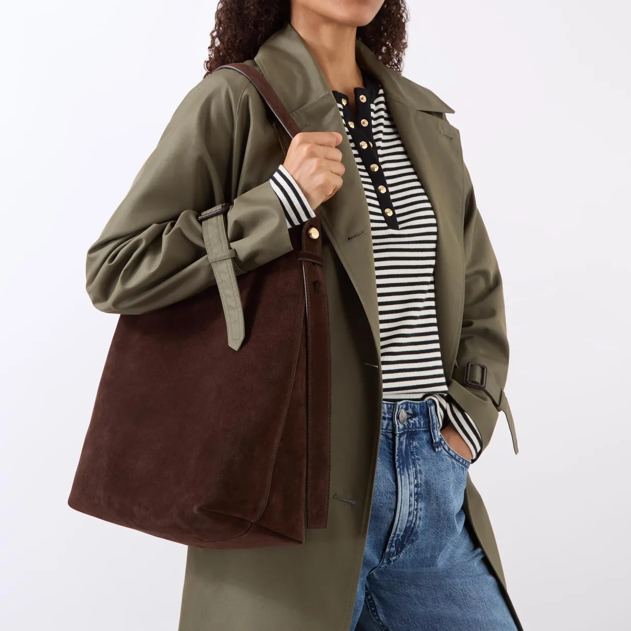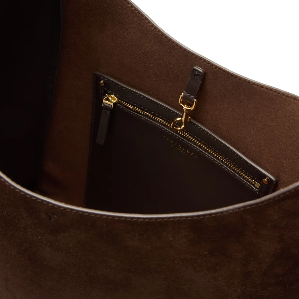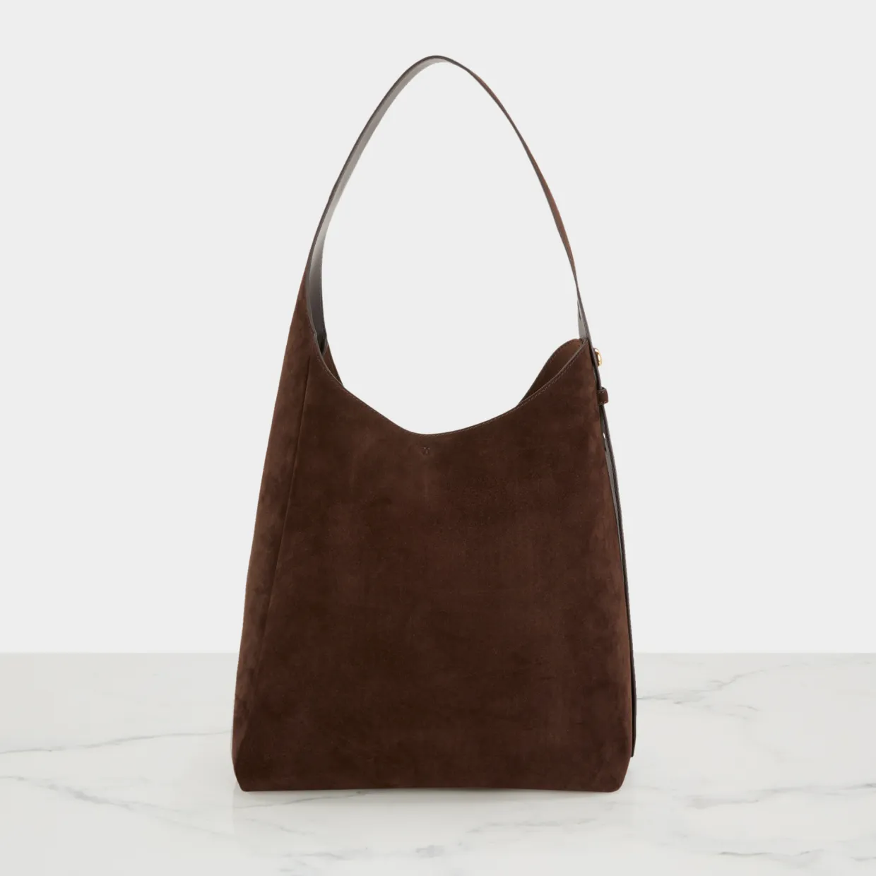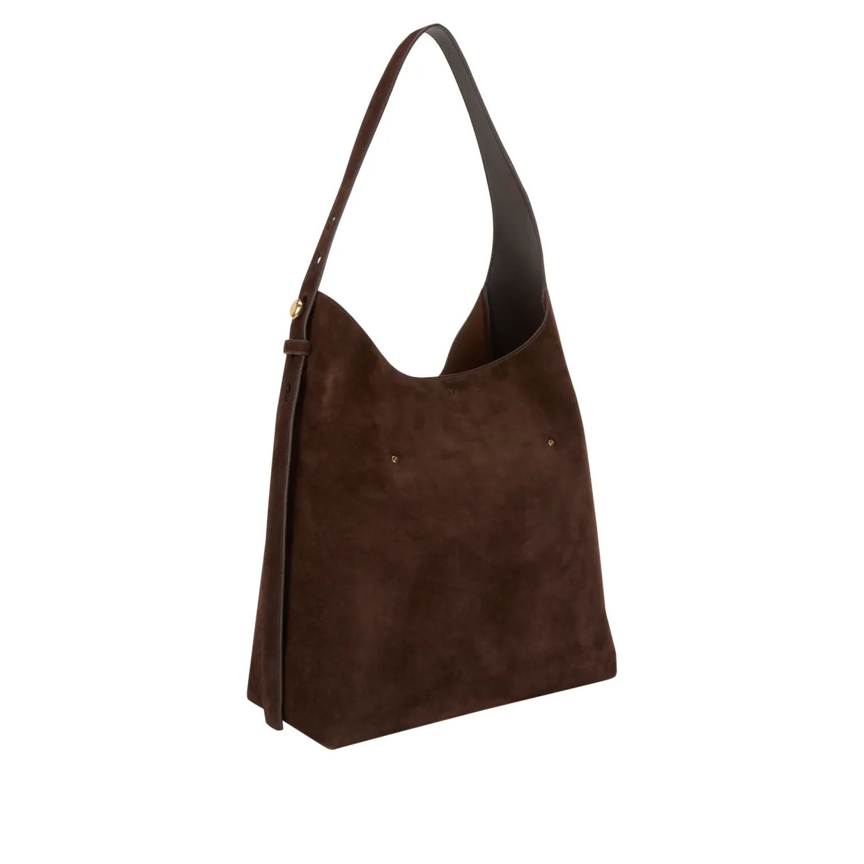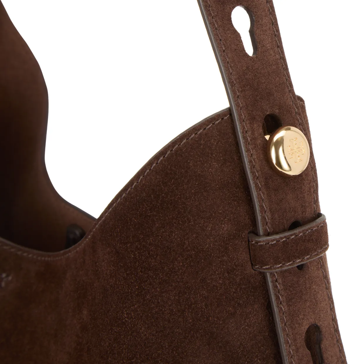 - Adjustable shoulder strap, open-top design, gold-tone hardware, suede leather finish, tonal stitching, structured silhouette