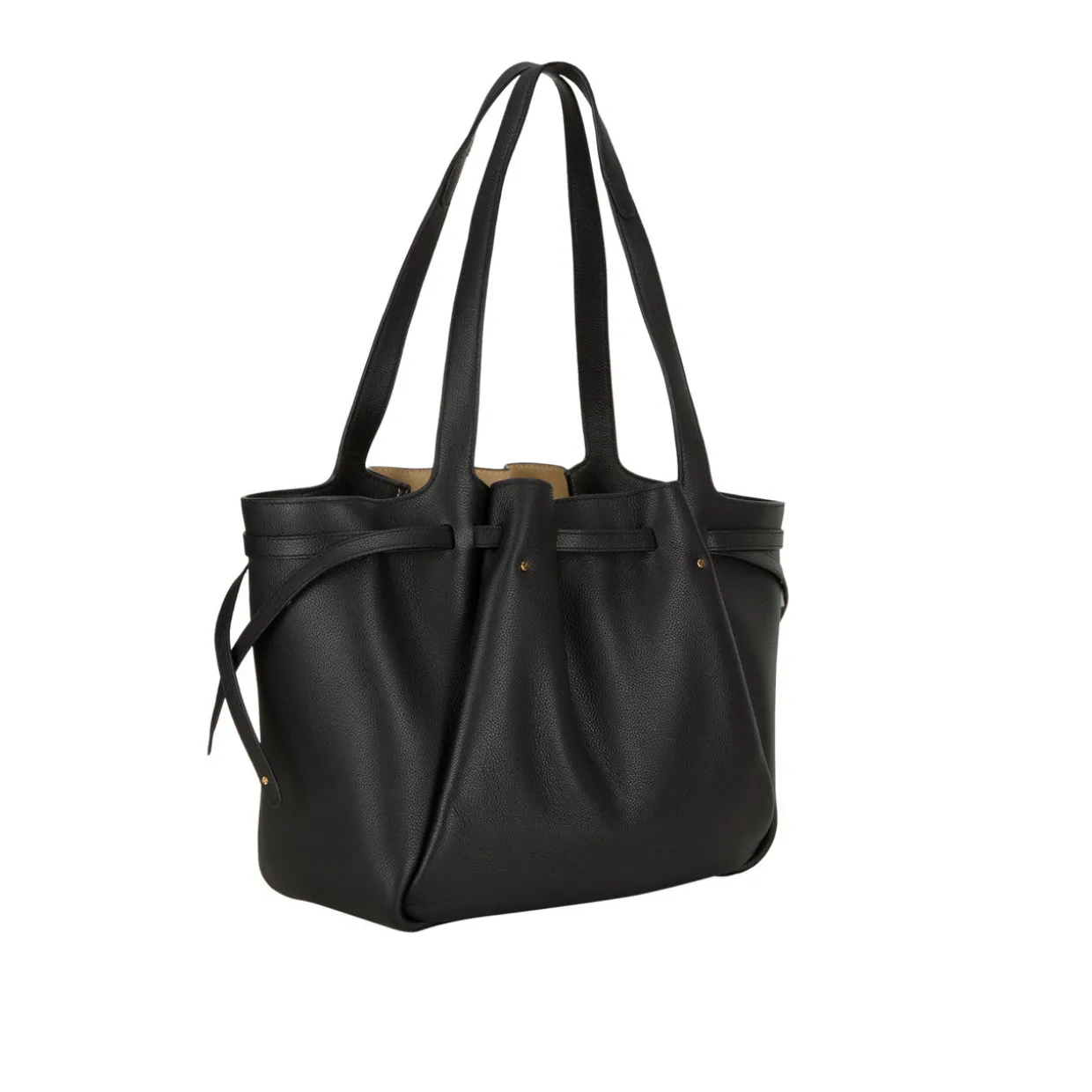 - Pebbled leather, magnetic snap closure, belted strap with stud closure, double top handles, gold-tone logo hardware, dust bag