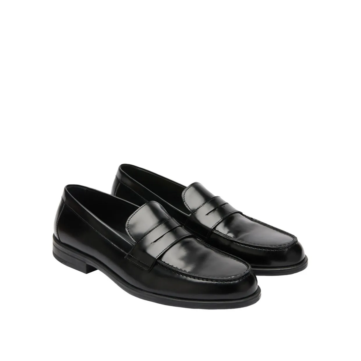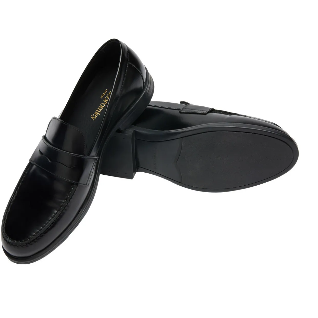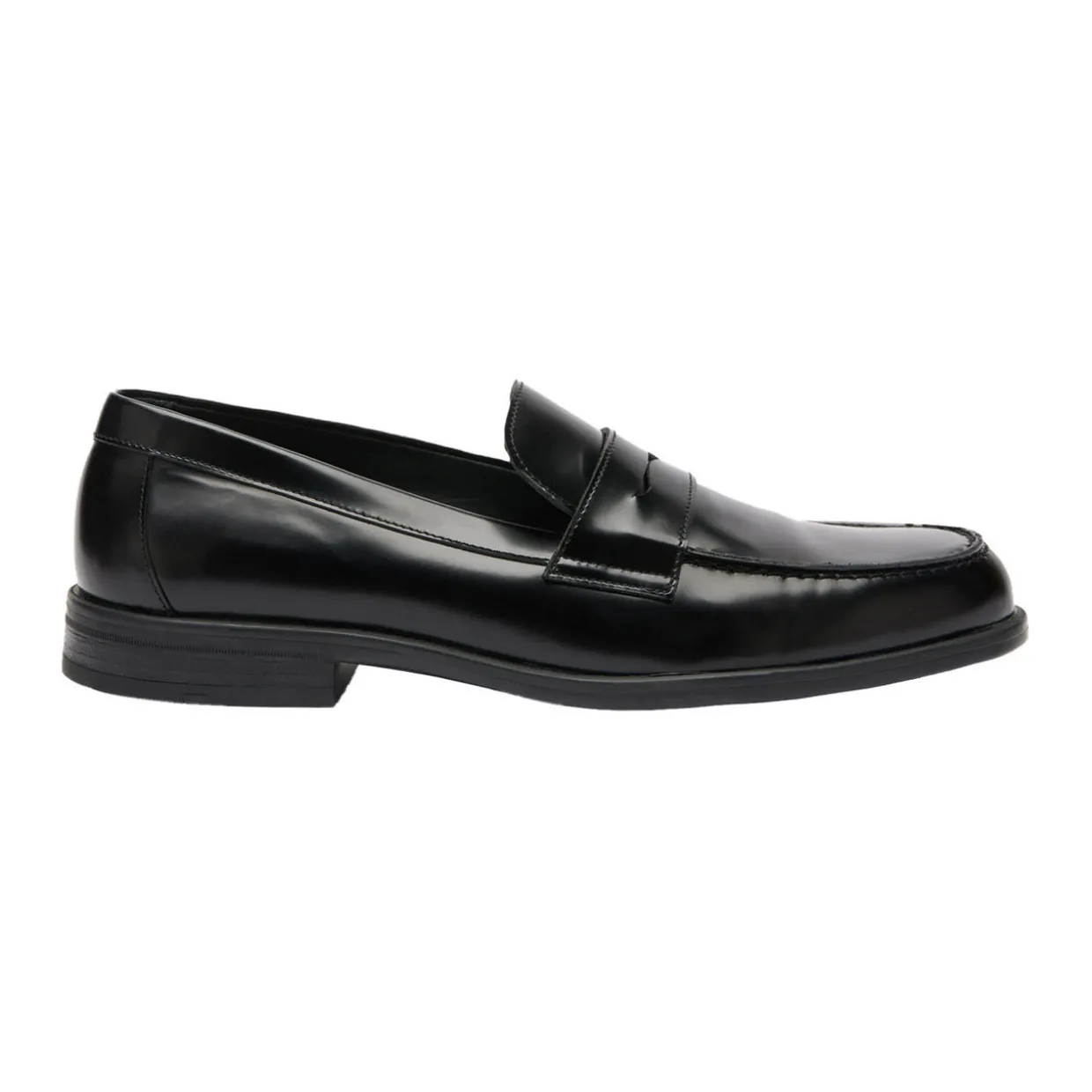 - Glossy leather finish, high-shine, classic penny saddle trim, round toe, traction rubber sole, slip-on style