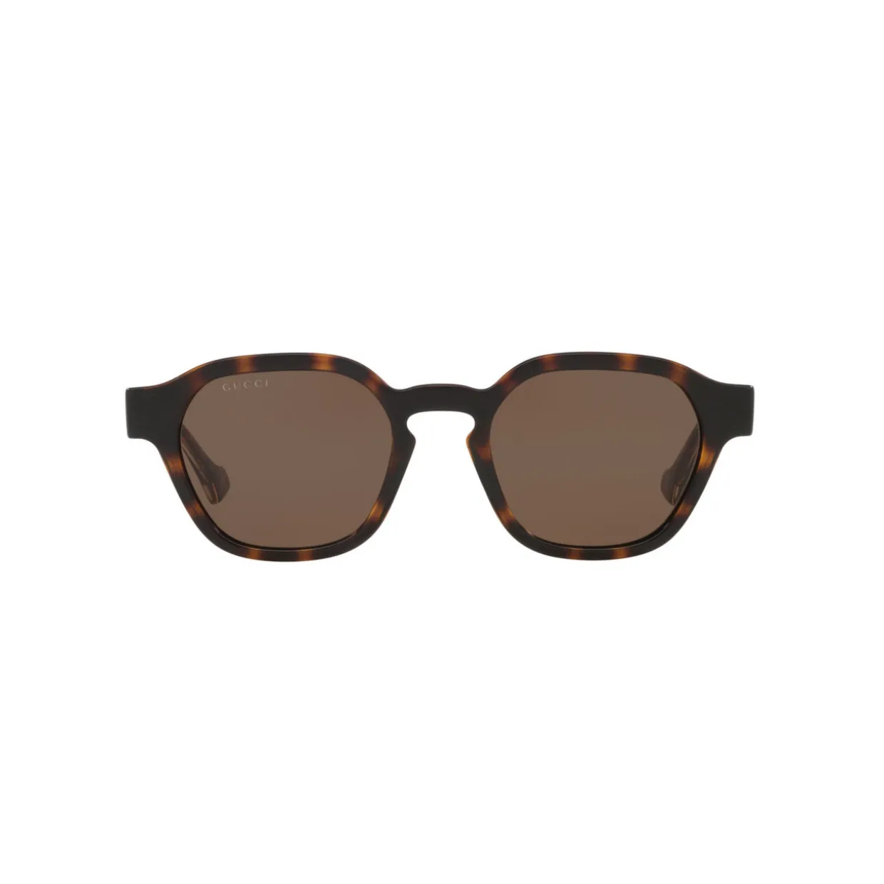 - Round frame, solid-coloured model, tortoise lens, polished finish, full rim