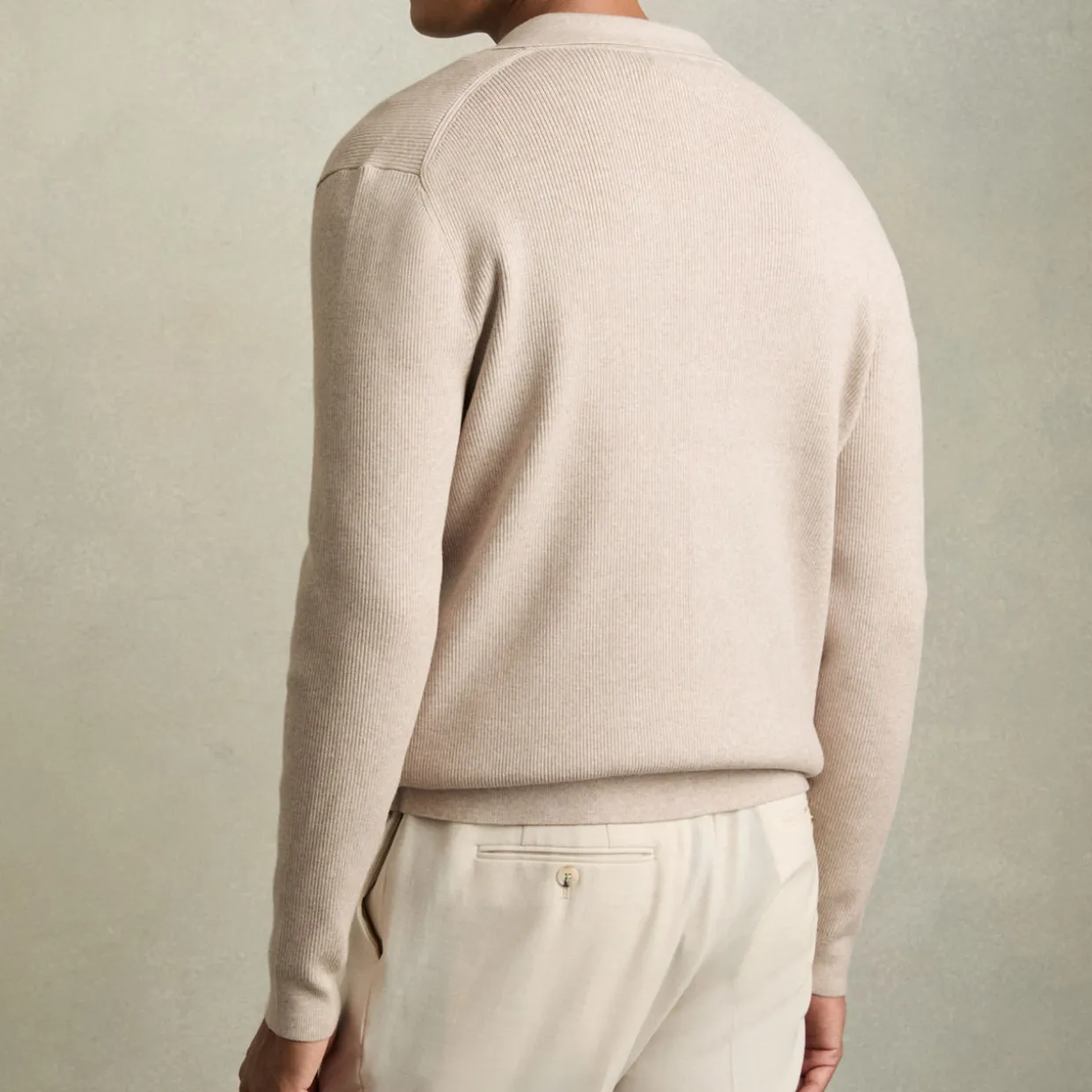 - Flat collar, full button fastening, long sleeves, ribbed trims, knit structure