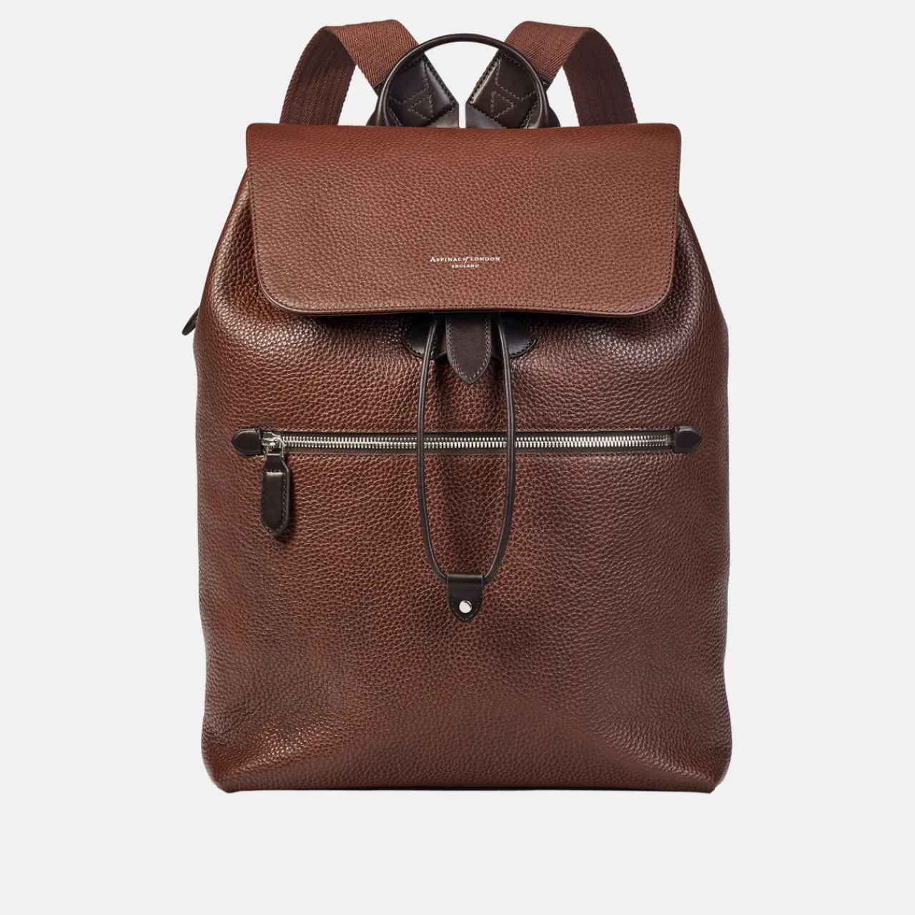 - Flap closure with adjustable drawstring closure and snap button fastening, adjustable webbing straps, two exterior pockets with zip fastenings, silver-tone hardware, logo lettering, grained leather texture