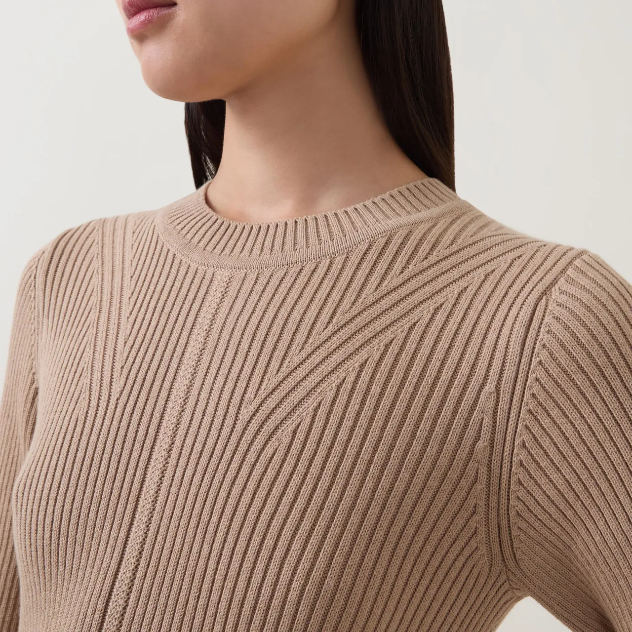 - Round neckline, long sleeves, midi length, rib knit structure, vent at back, logo detail