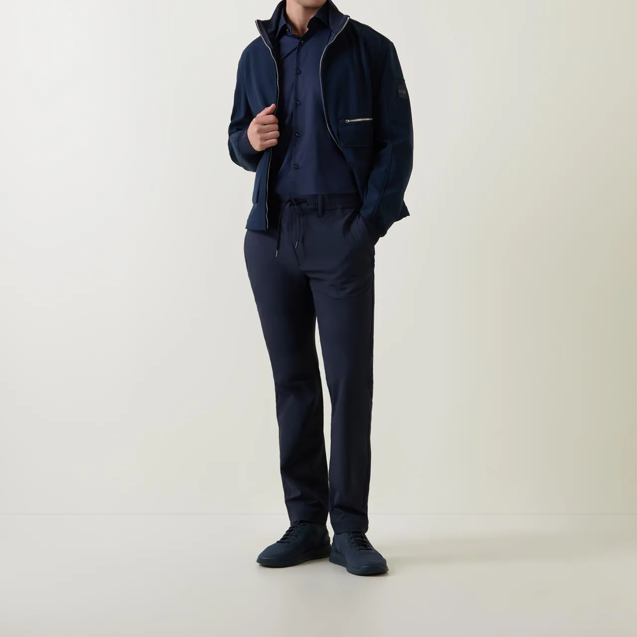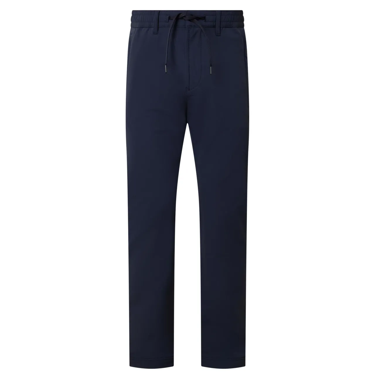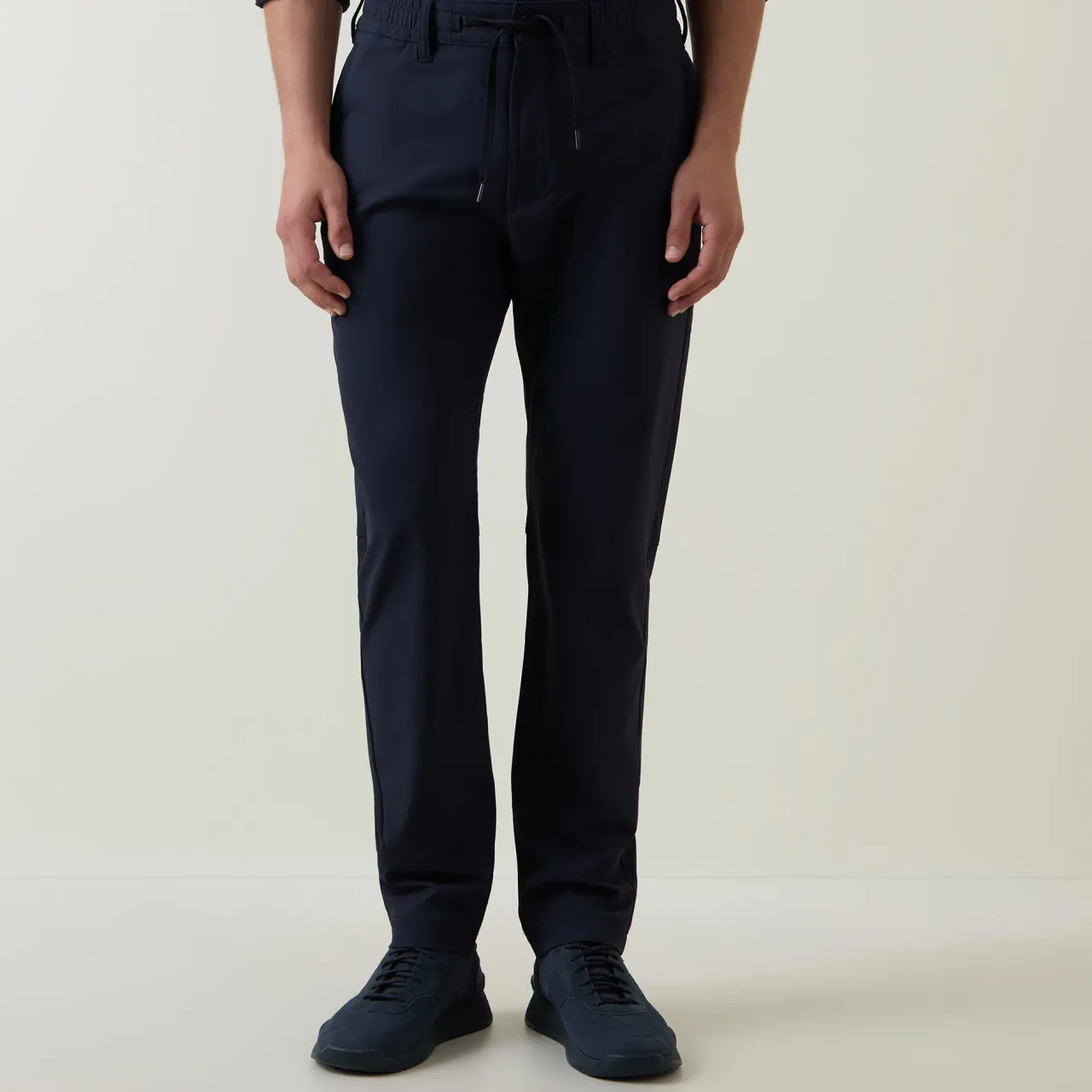 - Elasticated drawstring waistband, belt loops, two side in-seam pockets, two rear welt pockets, mid-rise, straight-cut leg, pressed creases, smooth fabric
