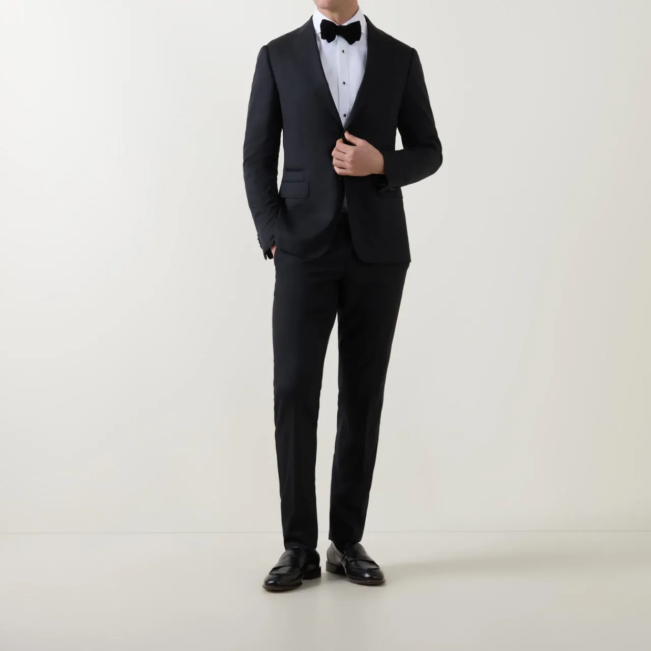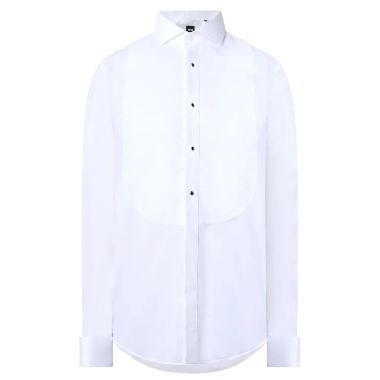 - Tuxedo bib design, long sleeves, slim fit, spread collar, contrast button fastenings, double cuffs, stretch cotton poplin fabrication, easy-iron finish