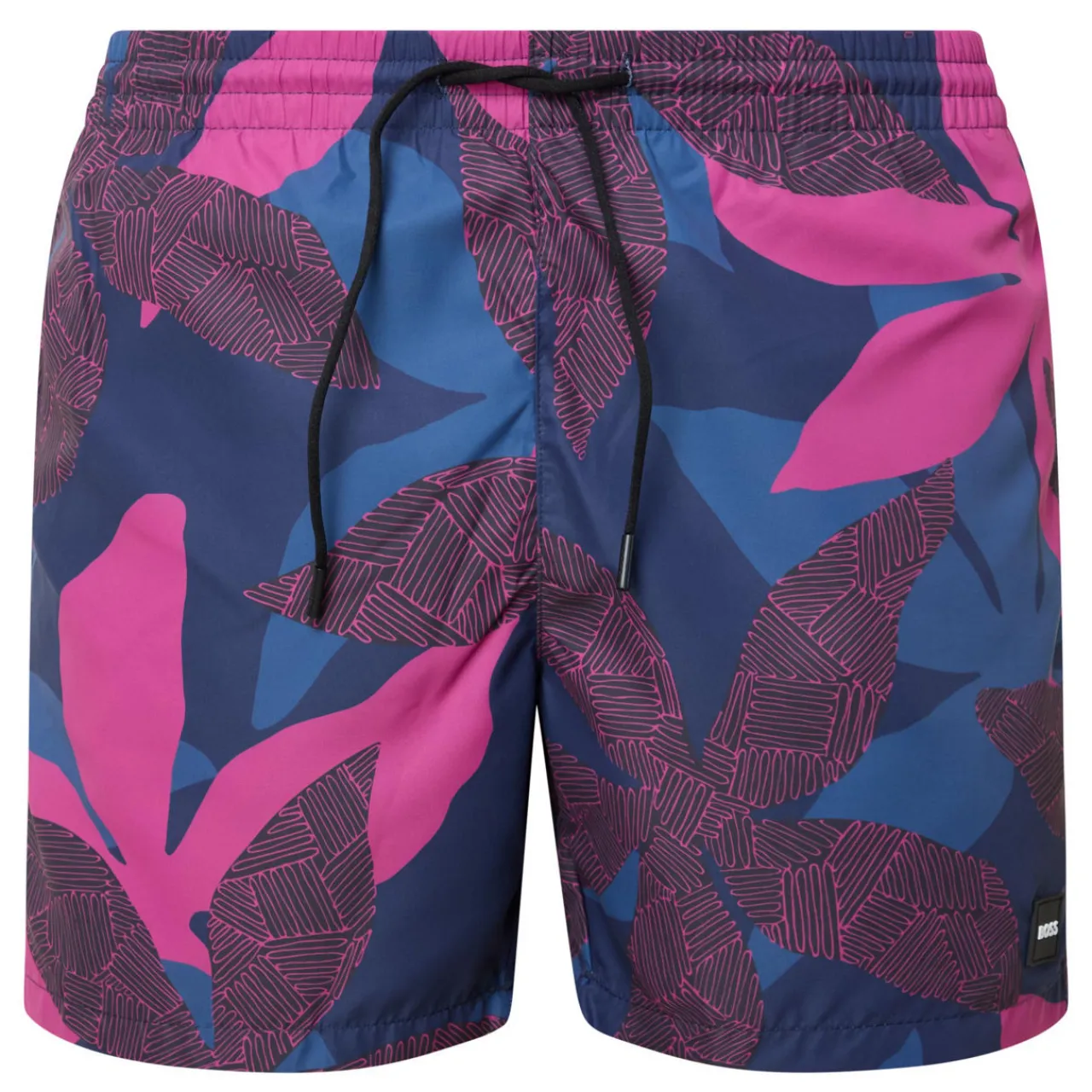 - Elasticated waistband, adjustable drawstring fastening, two side in-seam pockets, rear patch pocket with logo tag, bold printed design, contrasting colours, smooth finish