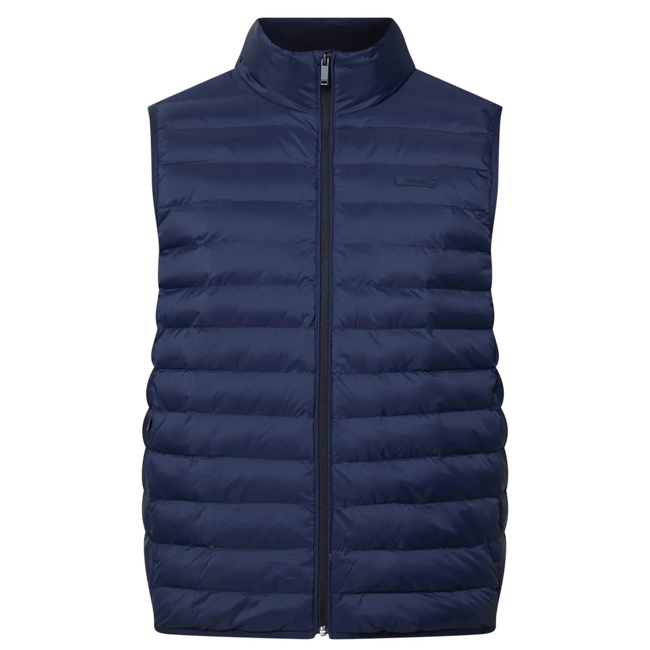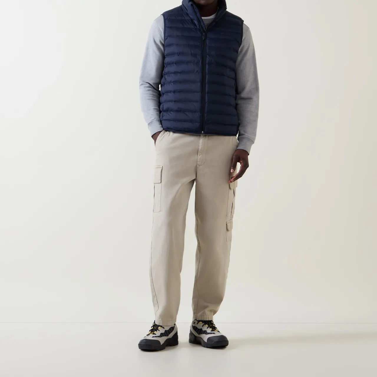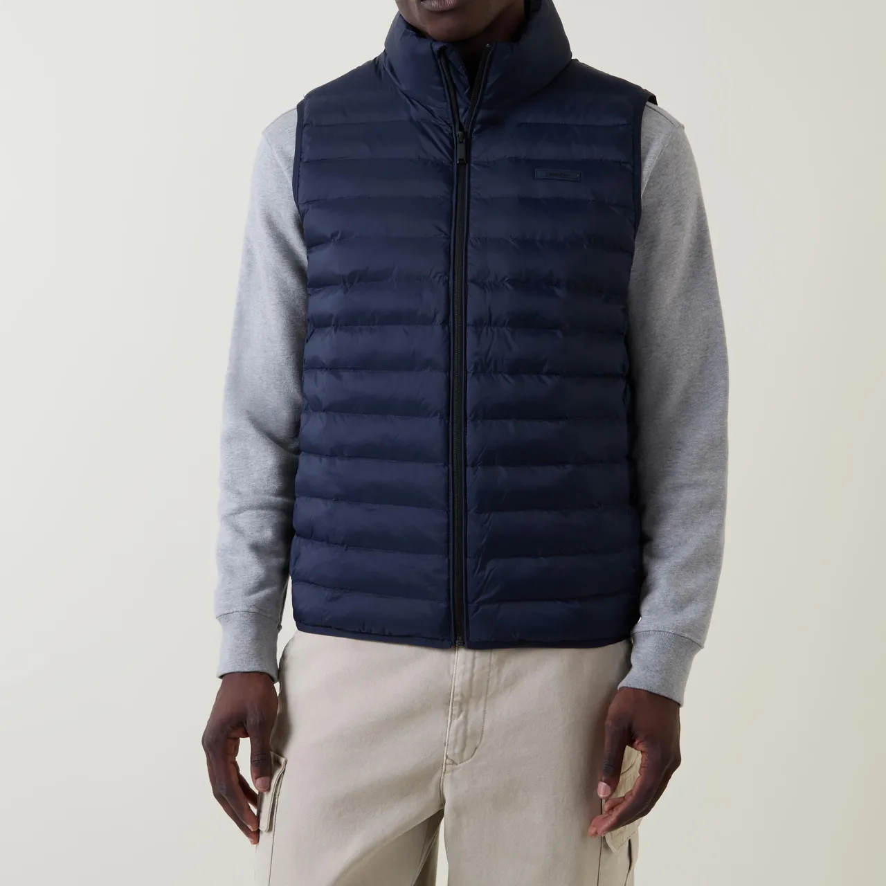 - Stand-up collar, sleeveless, full zip-through fastening, two side zipped pockets, padded finish