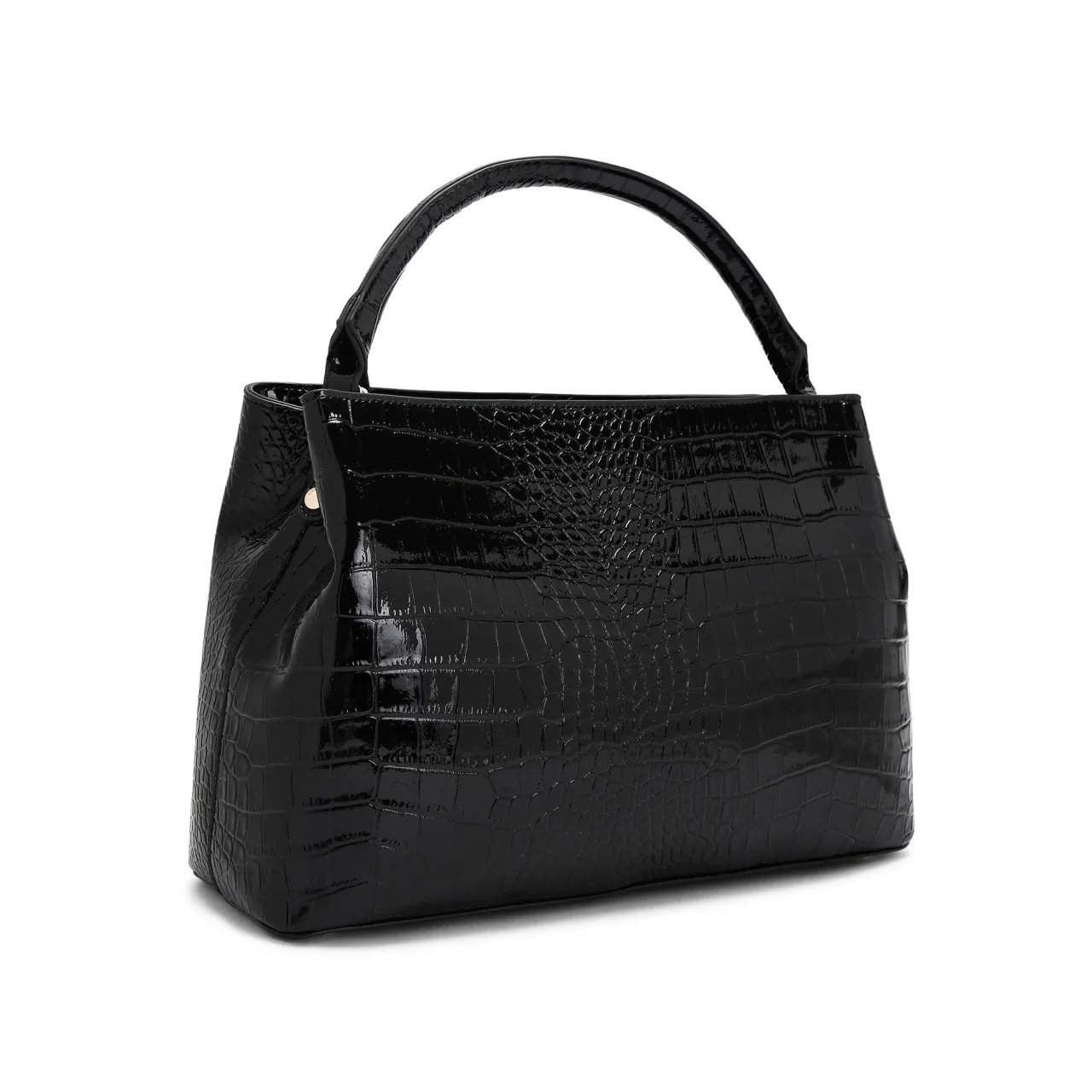 - Large tote silhouette, patent croc-embossed leather alternative, top handle, gold C plate branding
