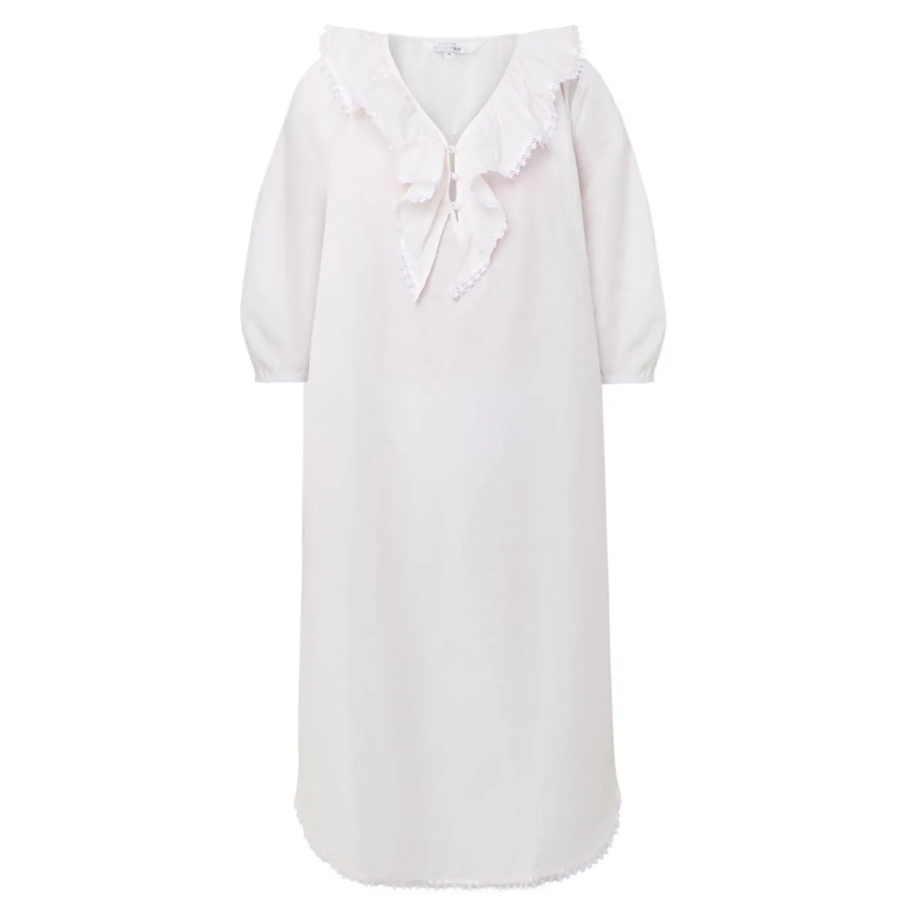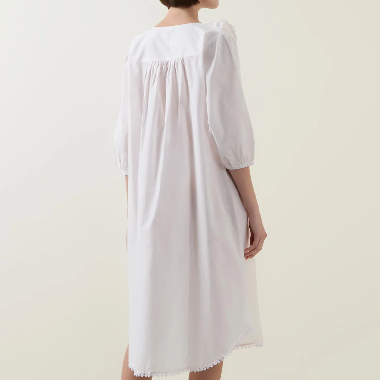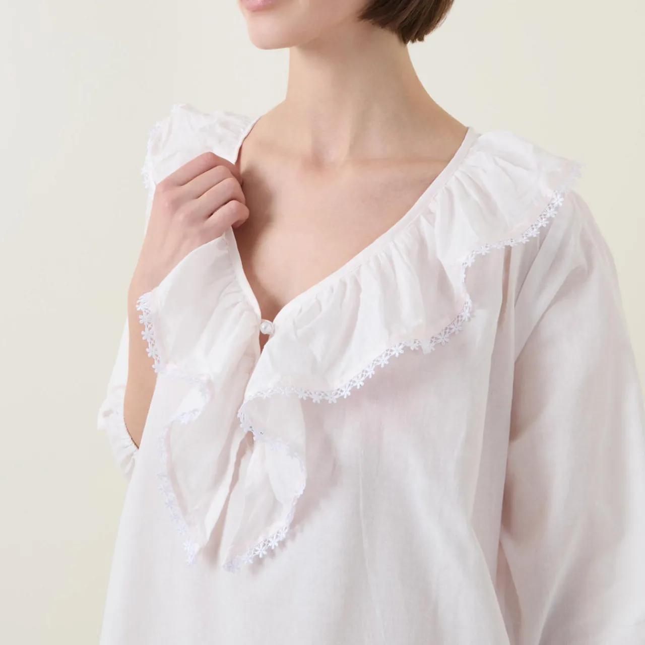 - V-neckline, three-button placket, ruffle-trim collar, half-length sleeves, elasticated cuffs, rear gathered detailing, curved hem, guipure lace detailing throughout, lightweight, mid length