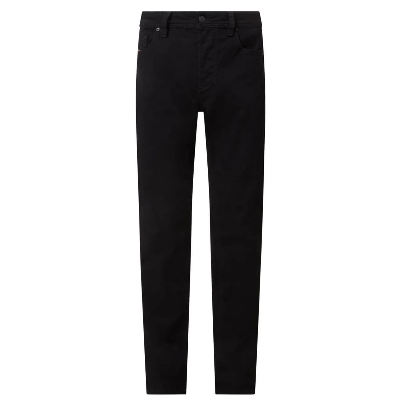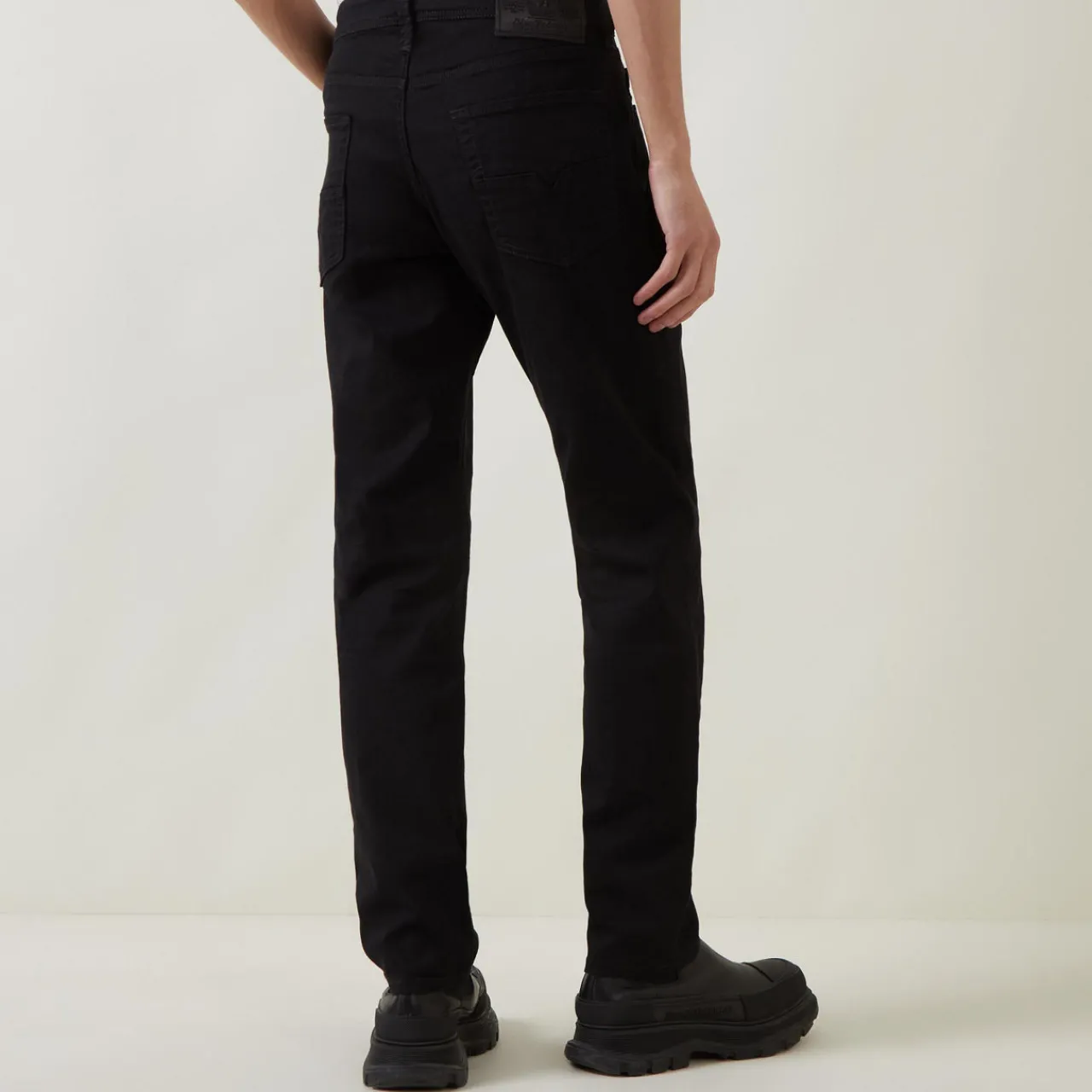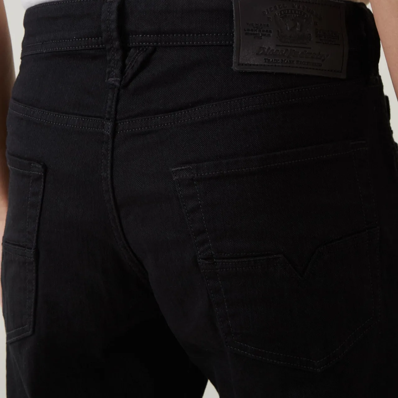 - Zip fly and button closure, belt loops, five-pocket design, tonal stitching, logo patch, smooth denim finish