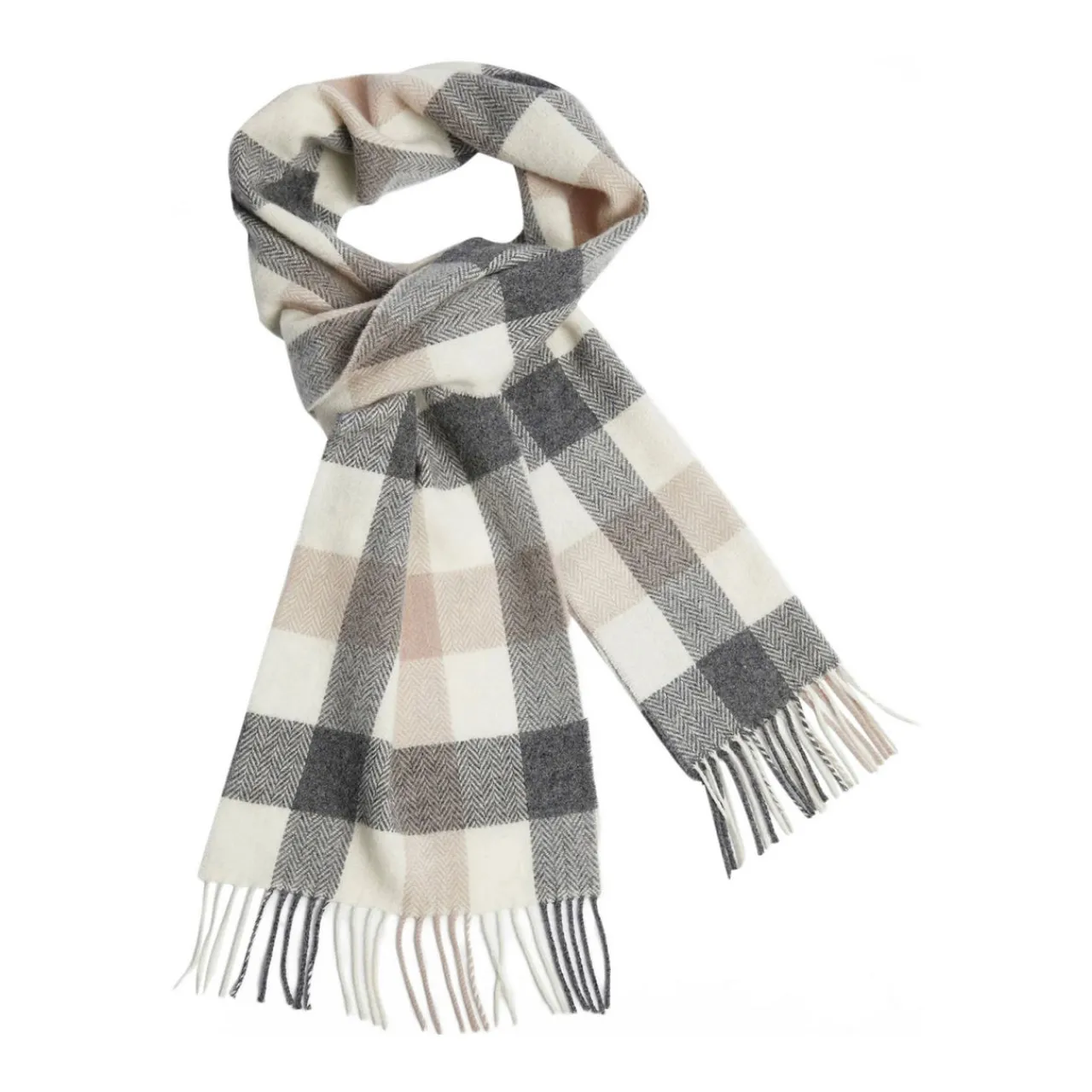 - Wrap-around style, block check print pattern, fringed edges, logo tag, soft finish